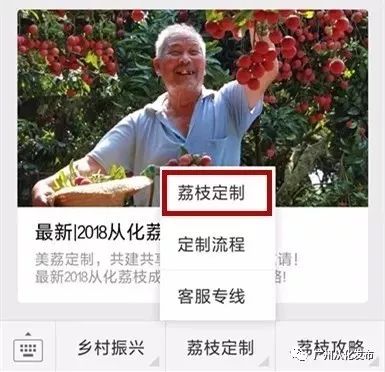 今年,从化区开展“乡村振兴•美荔定制”为主题的2019年从化荔枝定制嘉年华活动,推出“荔枝+生态小镇建设”“荔枝+公益”“荔枝+旅游”“荔枝+粤菜”“荔枝+港澳”“荔枝+哈尔滨”“荔枝+北京”“荔枝+高校”“荔枝+企业”等定制活动。通过“请进来、走出去”,拓宽荔枝销售渠道,以“荔枝+”定制活动为平台,充分发挥从化优质农旅产品定制销售新模式带动农旅融合作用。荔枝定制销售模式不仅促进了荔枝的销售、增加农民的收入,更成为乡村整合农业与文旅资源、对接市民消费需求升级新要求的重要媒介。