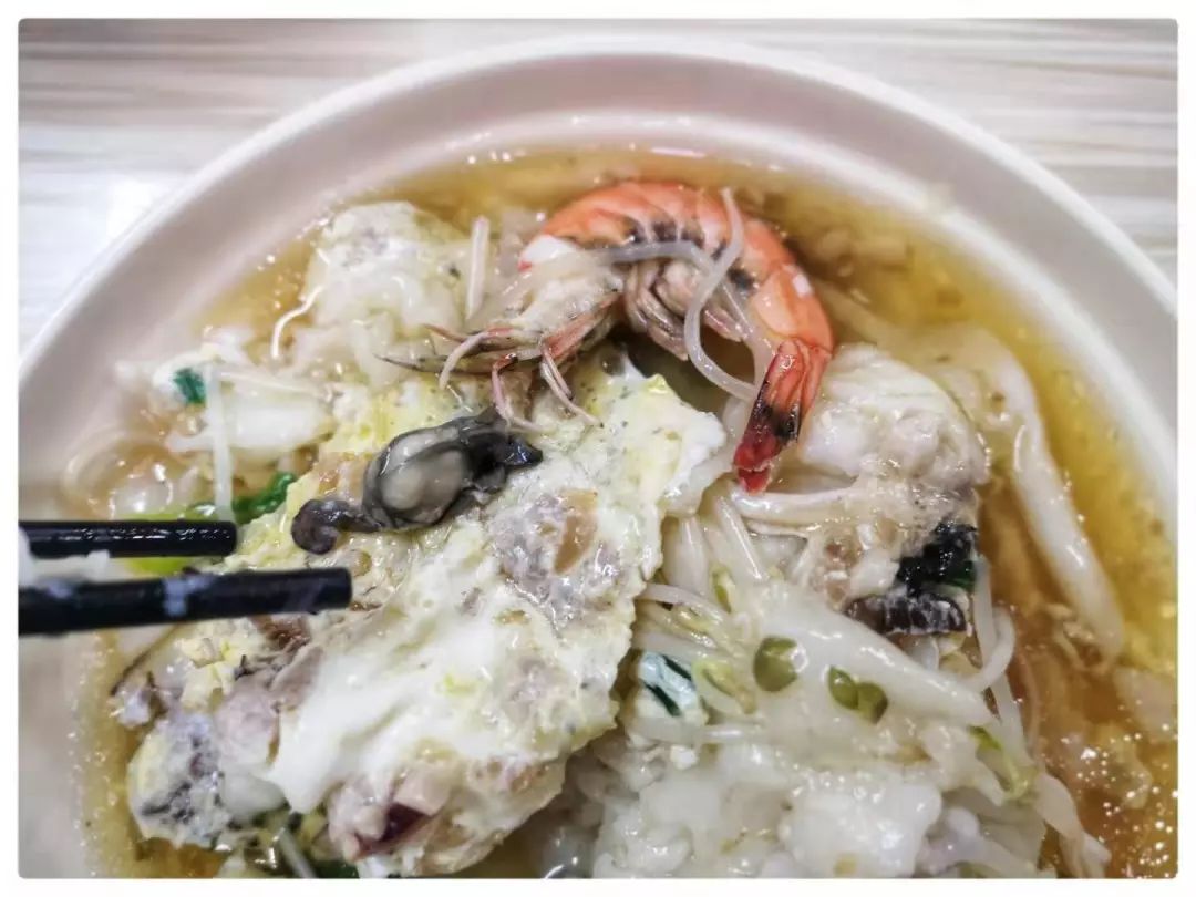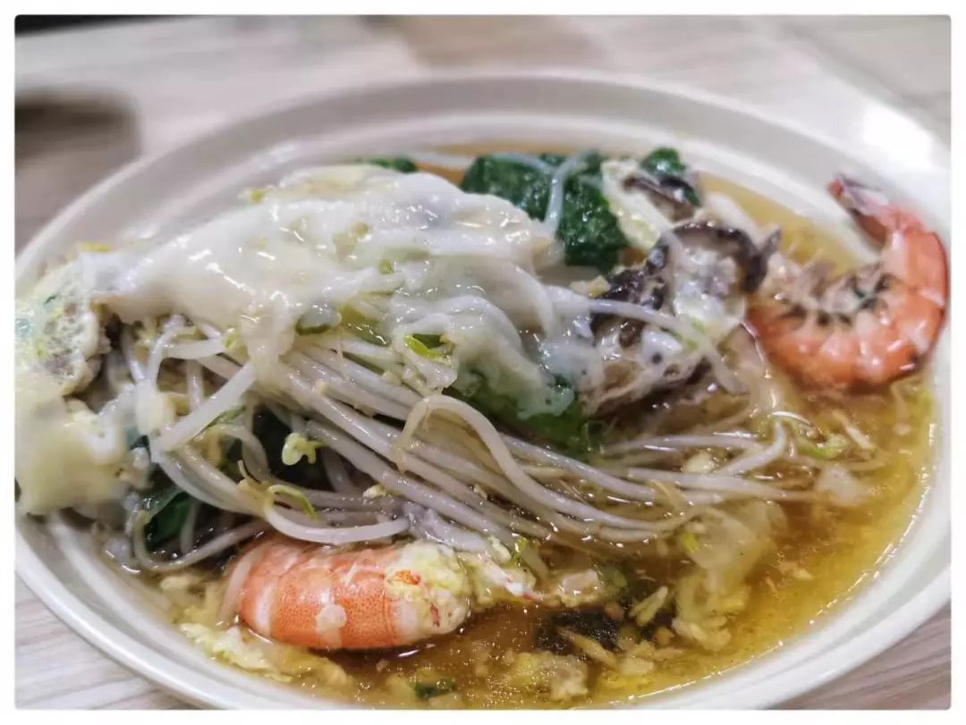 寡淡的米浆经过高温蒸气的加工,变成半透明的粉皮,随后加入鲜虾、蚝仔、鱿鱼、香菇、豆芽,浇上潮汕特色的汤汁,平凡的食材造就了非凡的味道。汤汁香口浓郁,粉皮非常滑嫩,馅料丰富多样,这是一道能唤醒食欲的美食。