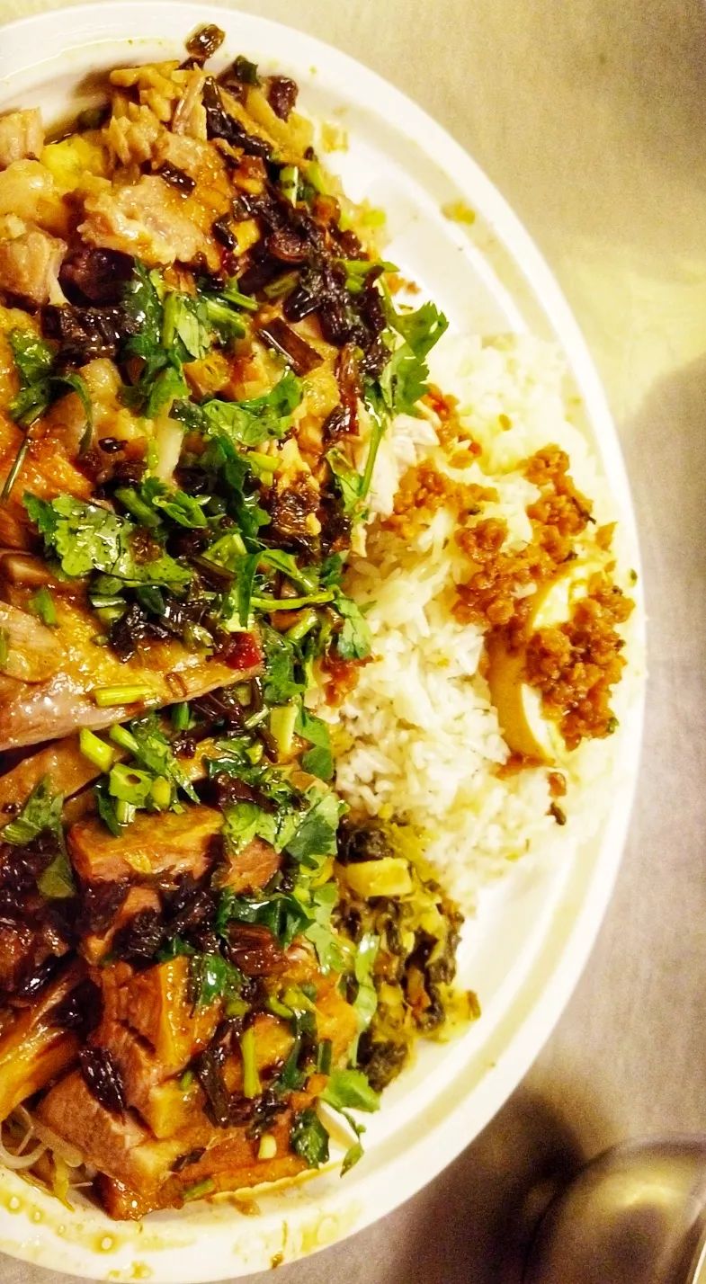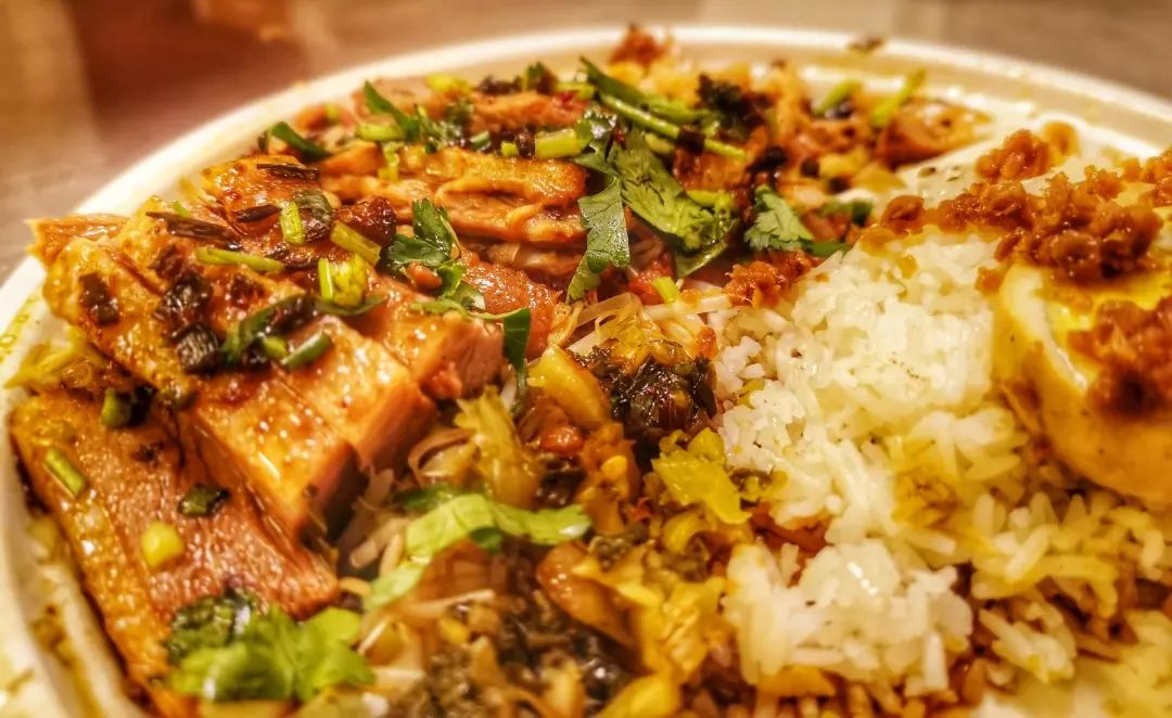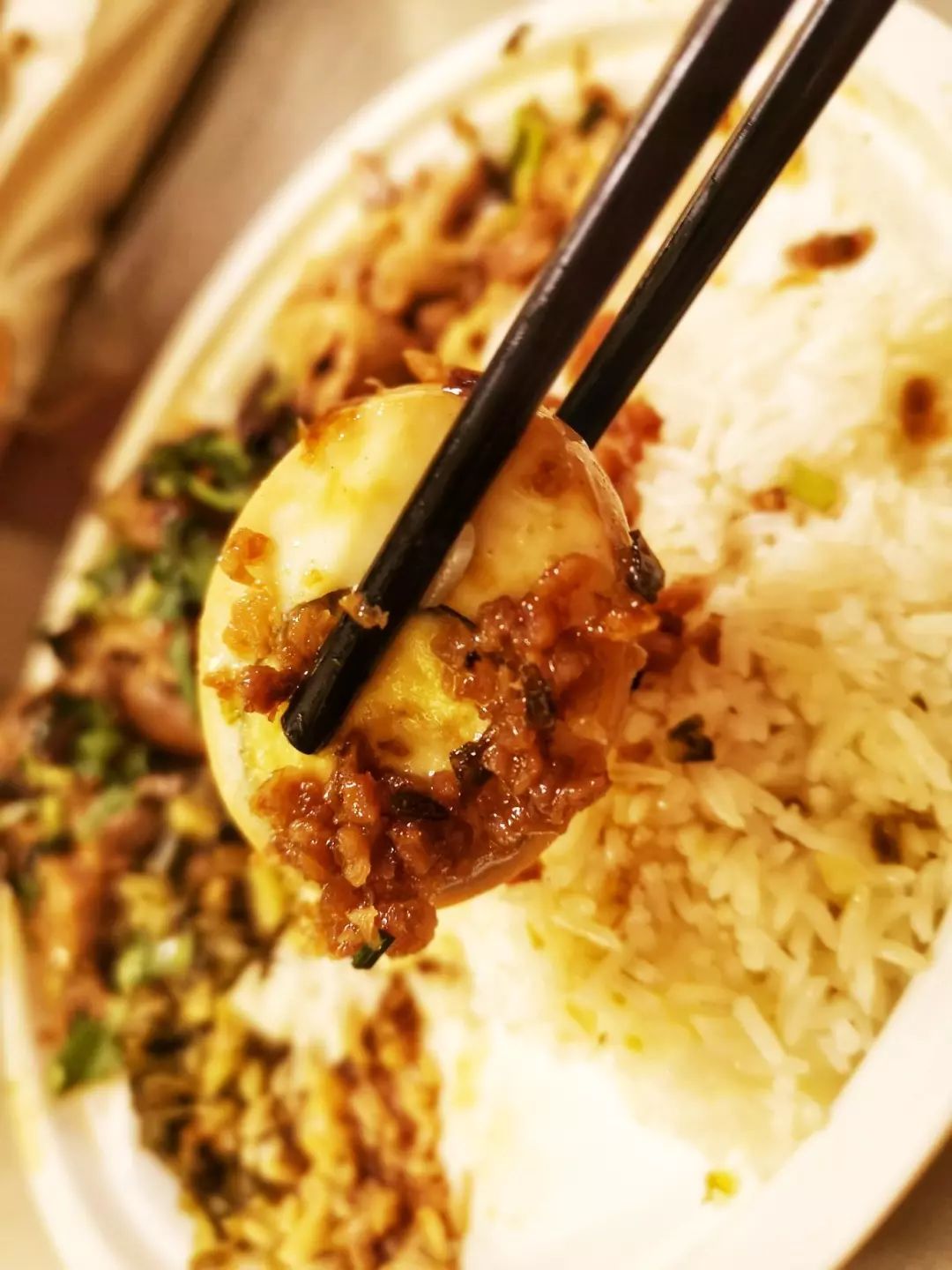 双拼,无疑是猪脚和鹅肉的爱情结晶,肥瘦相当的碎猪脚拌上香菜,对半切开的卤蛋是整盘的精华,豆芽酸菜虽然是配角,但这默契的配合,造就了一碗优秀的猪脚饭,浇上肉汁的白米饭含有大量的碳水化合物能充分补充人体所需。