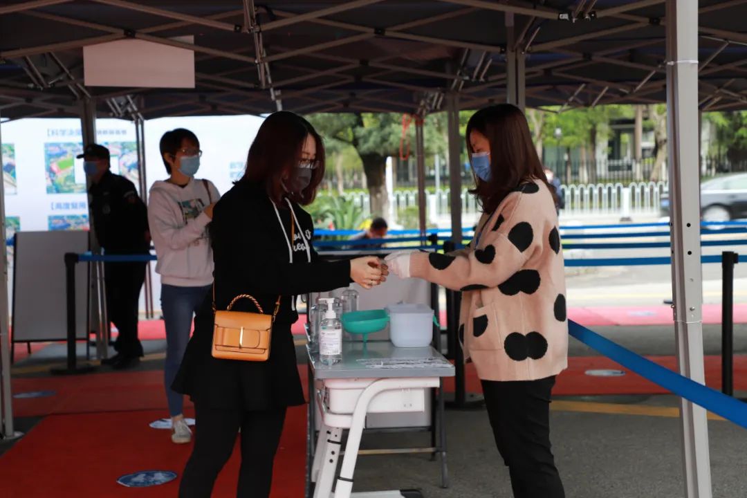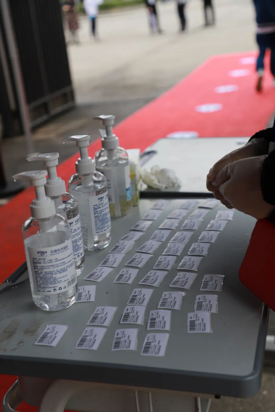 为高效及安全地完成本次检测,学校共设置了四个检测点,每位教职工和学生都拥有独立的编号与批次,入校后,每个人分批次、按编号走相应通道领取条形码,到指定检测点领取采集管后进行检测。