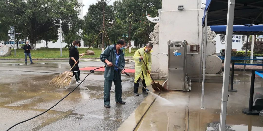 雨水天气,使地面有许多积水和黄泥,物业组织人员提前冲洗校园地面,以确保环境干净卫生。