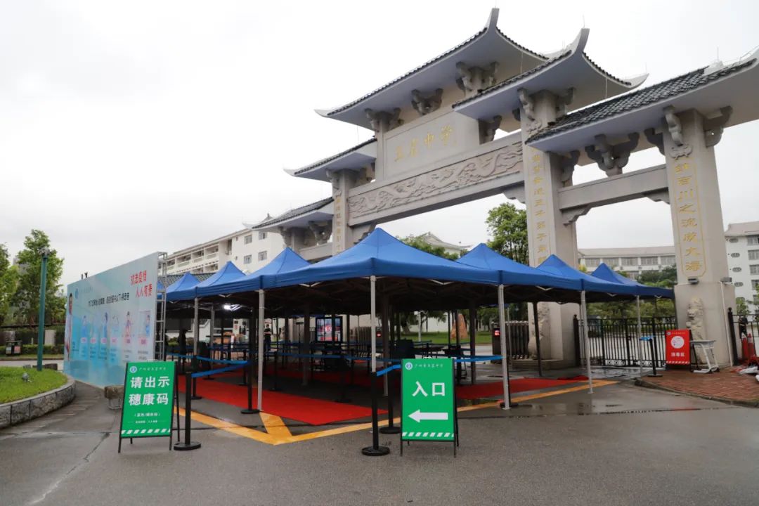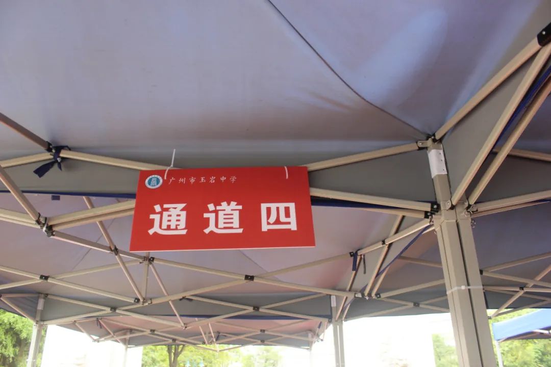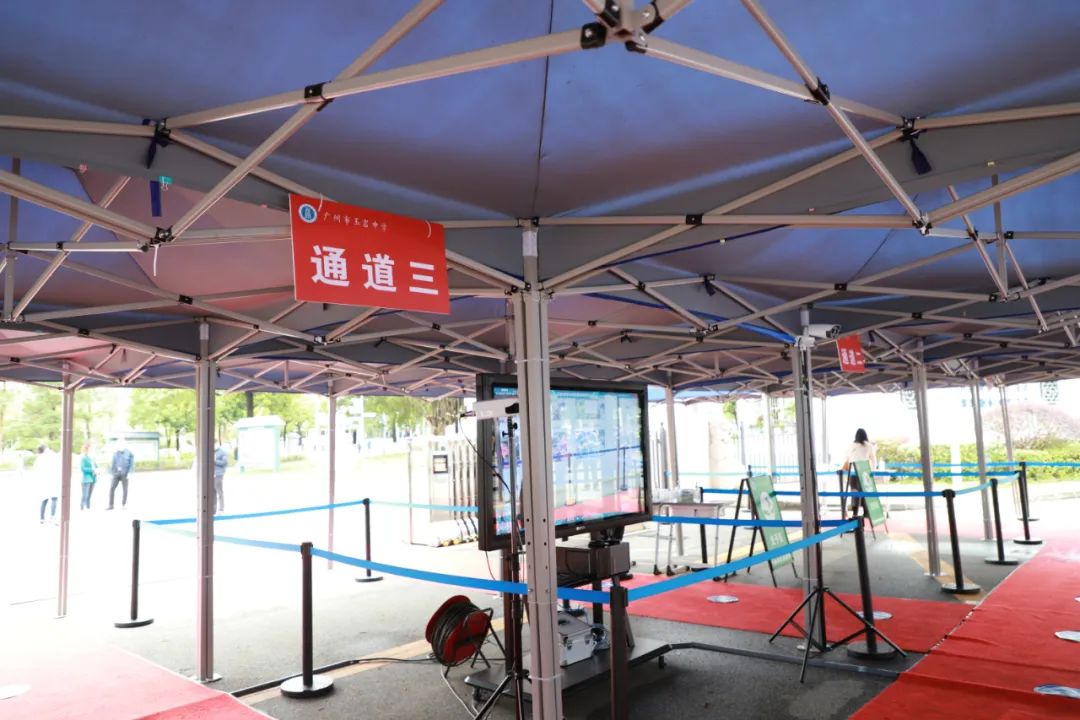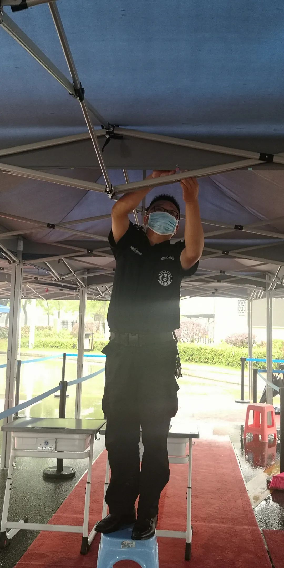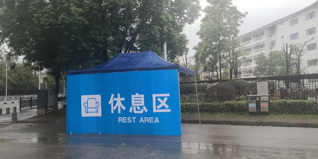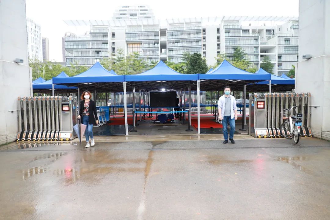 由文娟校助、教育服务处陈武龙主任、徐剑平主任助理连夜调配物资、搭建帐篷,协同学生工作处副主任李舜、李剑寒,在校门处搭建遮雨棚,并用红地毯区分出四条独立通道,保证排队有序、清晰,不受天气影响。