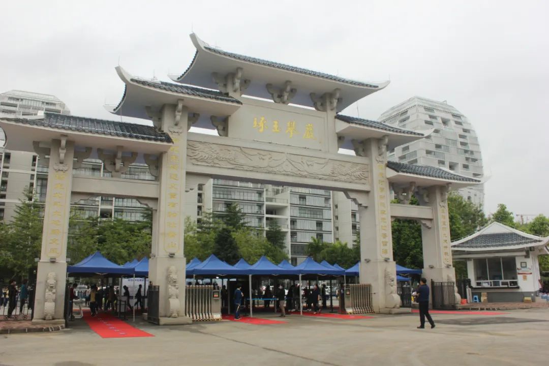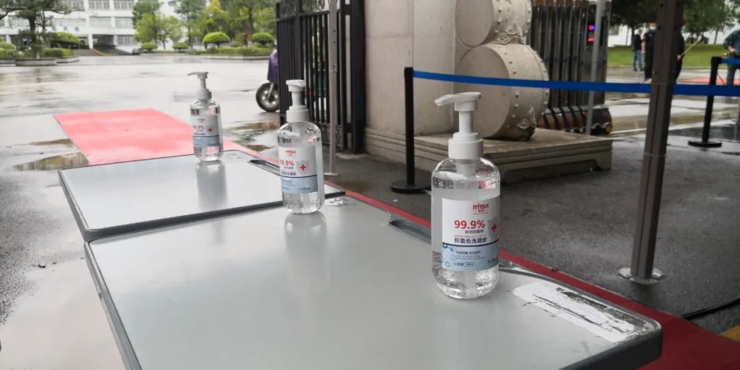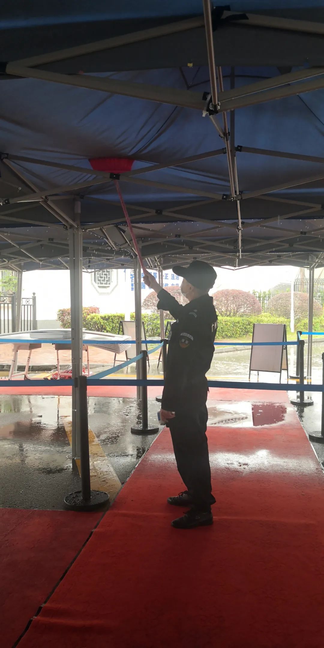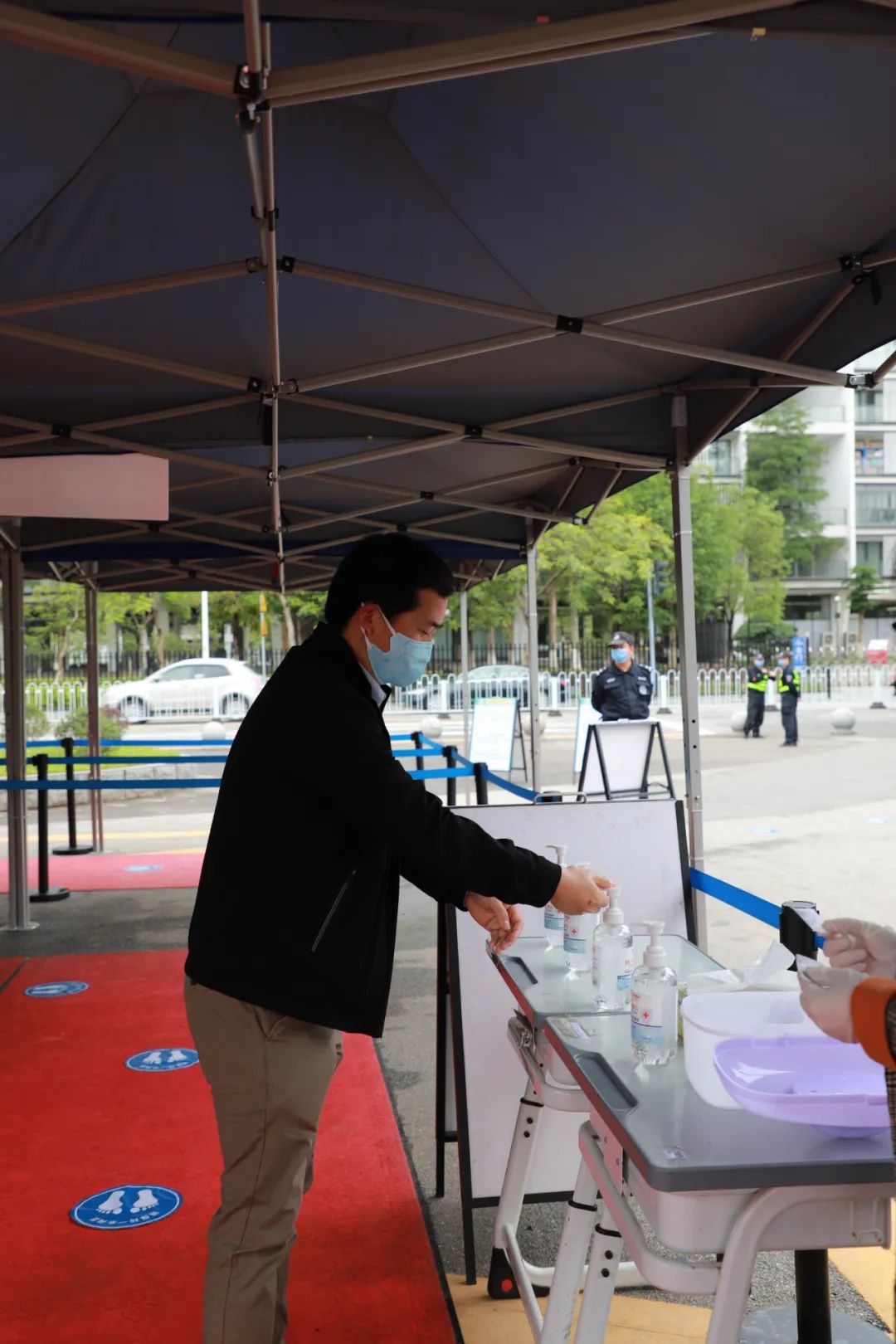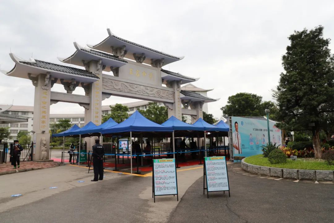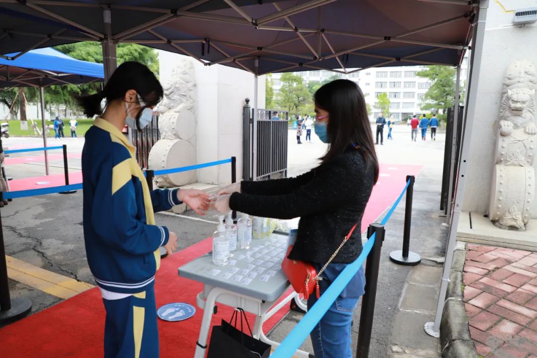 由文娟校助、教育服务处陈武龙主任、徐剑平主任助理连夜调配物资、搭建帐篷,协同学生工作处副主任李舜、李剑寒,在校门处搭建遮雨棚,并用红地毯区分出四条独立通道,保证排队有序、清晰,不受天气影响。