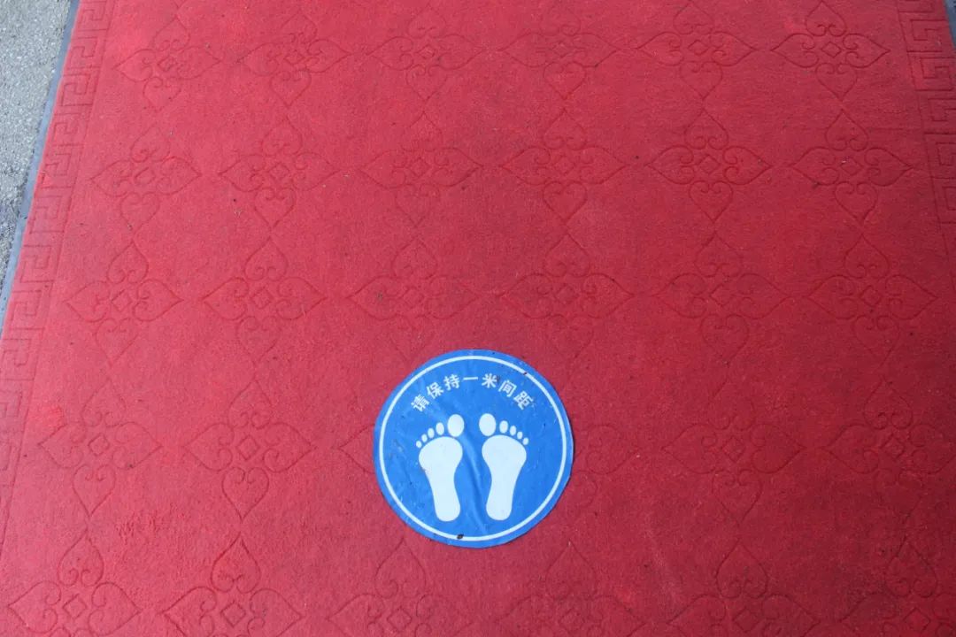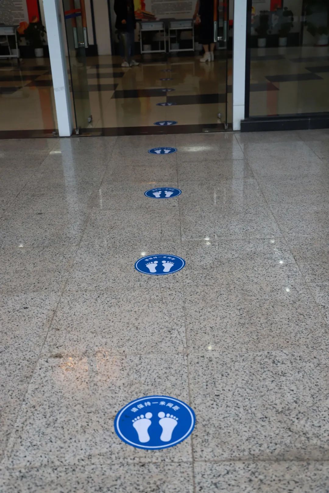 为清晰指引学生排队,保证间隔1米以上,避免人群聚集,在各个区域地面上贴清晰标记与指引。