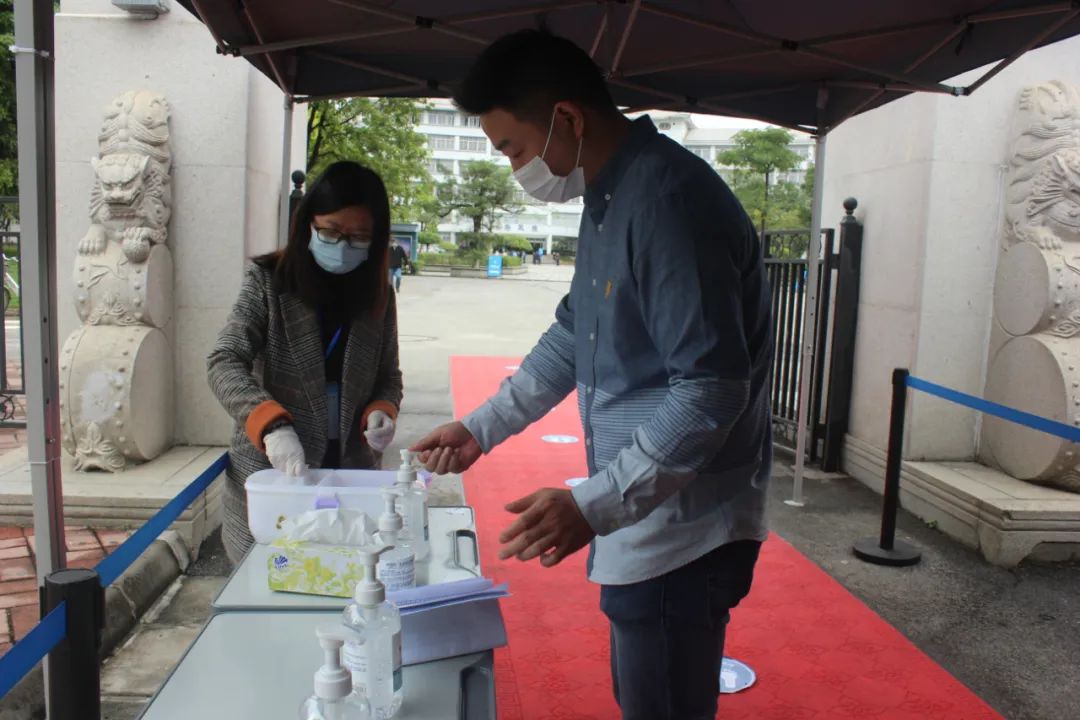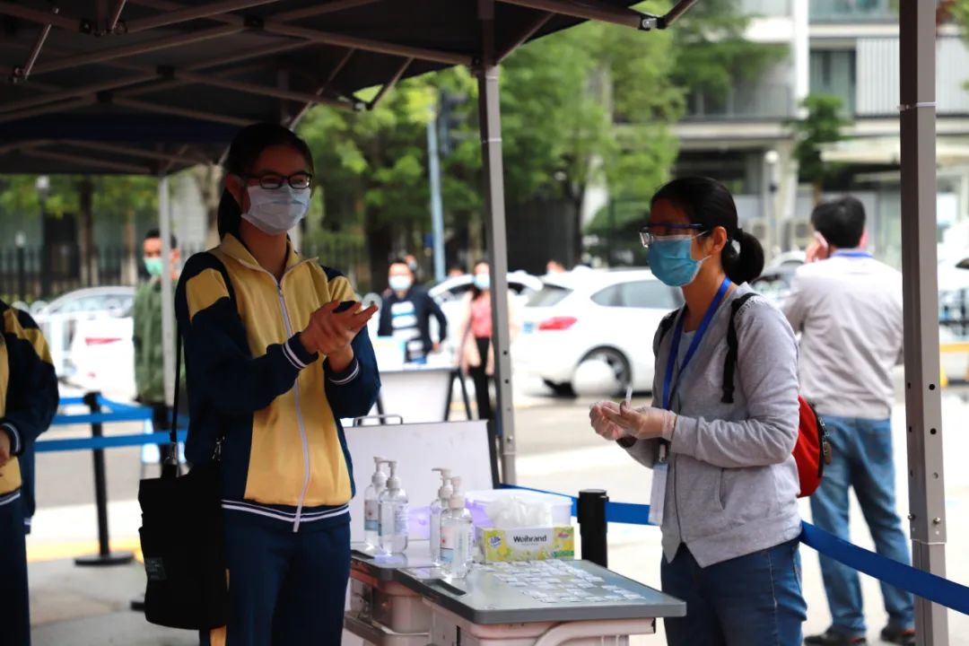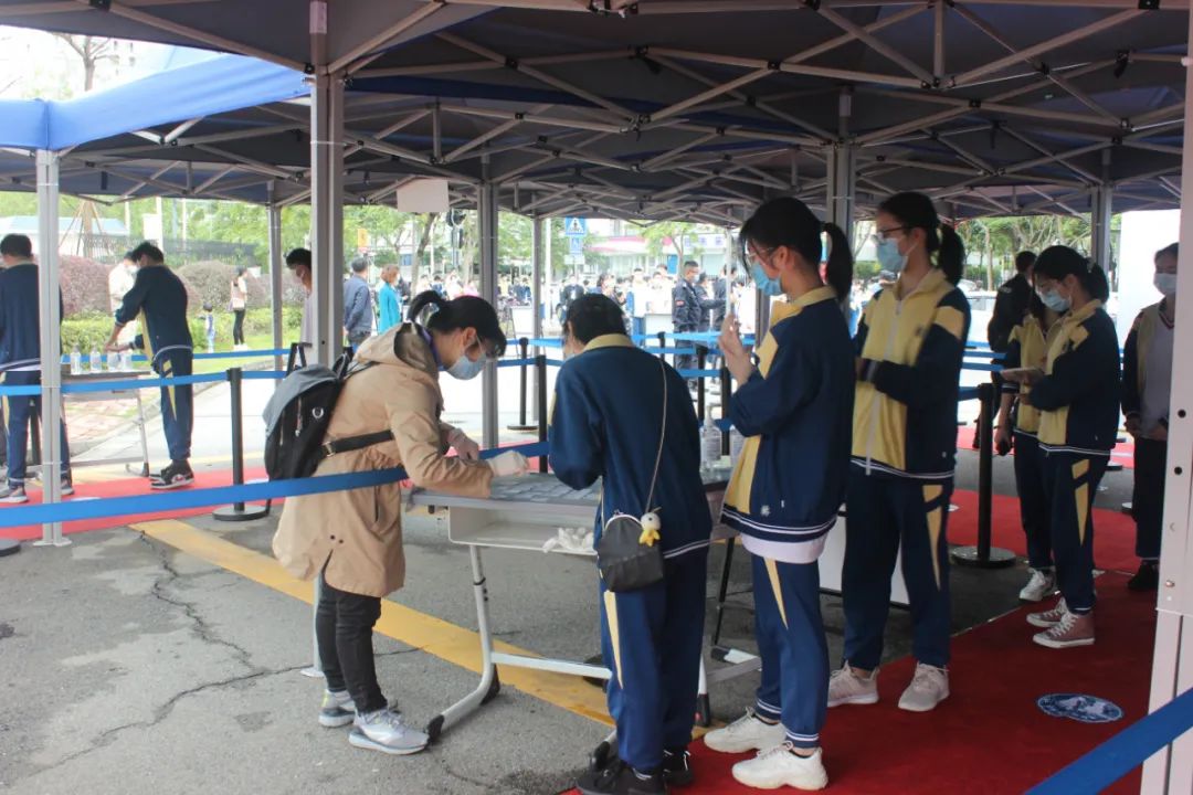初三级和高三级学生的核酸检测工作由学生工作处组织,2000余名学生分为七批次进行咽拭子采样。核酸检测前一天,学生工作处及年级主任在家长群向全体学生发出了清晰的流程指引。除现场工作人员外,每个班级的班主任均在入口处为本班学子发放条形码。