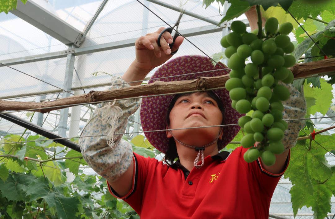 工人剪掉阳光玫瑰多余枝条,保证为葡萄生长提供充足营养