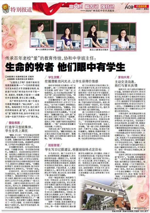 交谈中,四位班主任经常提到的是“爱学生”。“杨老师,你的眼里有我!”一名学生很爱给杨承彩老师打电话,每次都把这句话挂在嘴边。杨承彩老师说,教育是一门关于爱的学科,“带着爱的教育”始终是班主任工作的第一要务。陈卉老师表示,教育就是用一个生命去影响另一个生命,“当了近10年班主任,我从‘姐姐’变成了‘妈妈’,不变的是爱学生,这是开展所有工作的基调。”