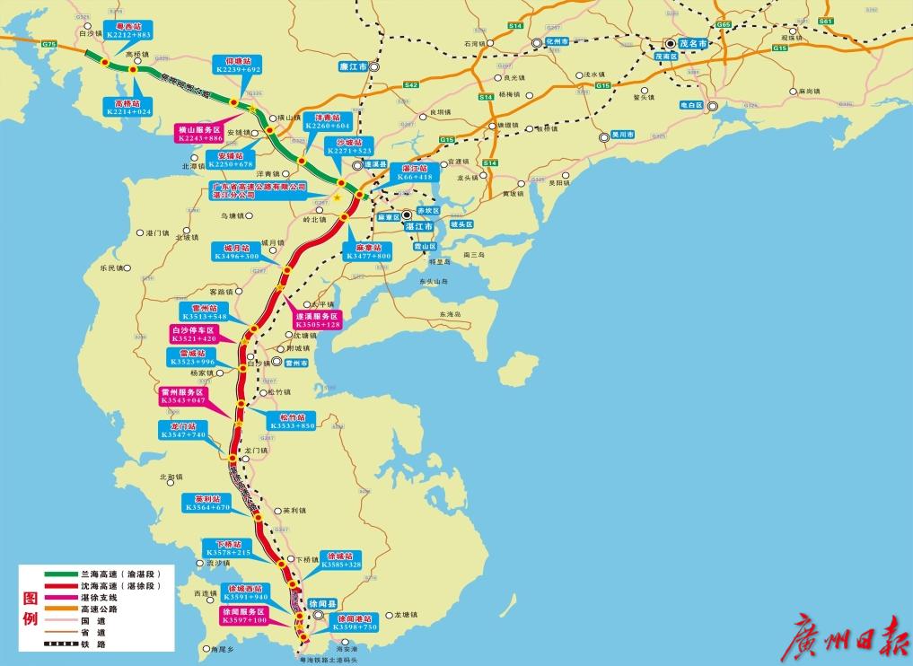 湛徐高速是国家高速公路网规划的13条纵向线路之一,是当前广东往海南的唯一陆路高速公路通道。徐闻港支线是湛徐高速的延长线,起于湛江市徐闻县下桥镇,终于徐闻县南山镇竹山村,与徐闻进港大道相接。路线全长约16.2公里,双向四车道,设计速度120公里/小时,全线设徐城西站、徐闻港站2处出入口,徐闻服务区1对。