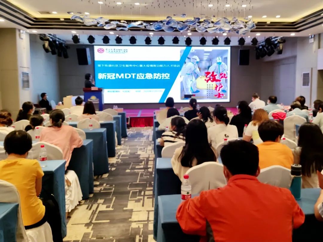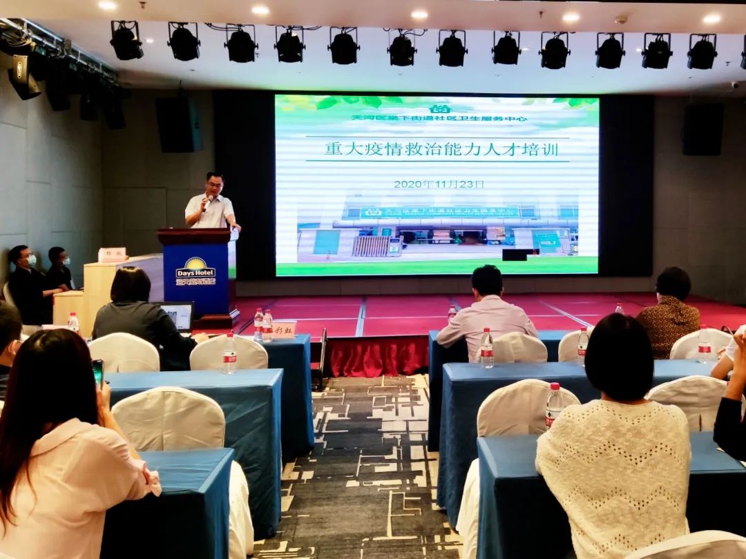 11月23日晚6点,棠下街道社区卫生服务中心邀请天河区医联体帮扶单位中山大学附属第六医院的四名专家学者,为棠下卫生服务中心的医护人员及驻守的集中隔离酒店涵天戴斯酒店的工作人员开展了一次系统、深刻的重大疫情防控救治能力人才培训。108人参与此次培训。