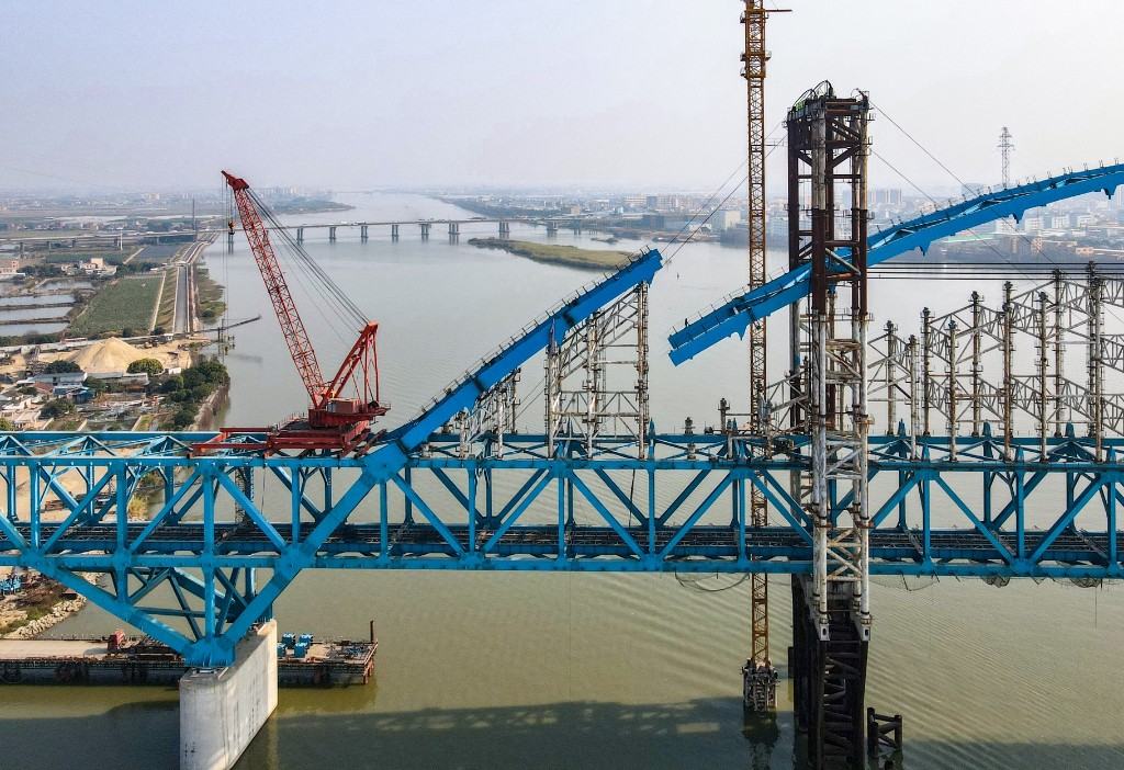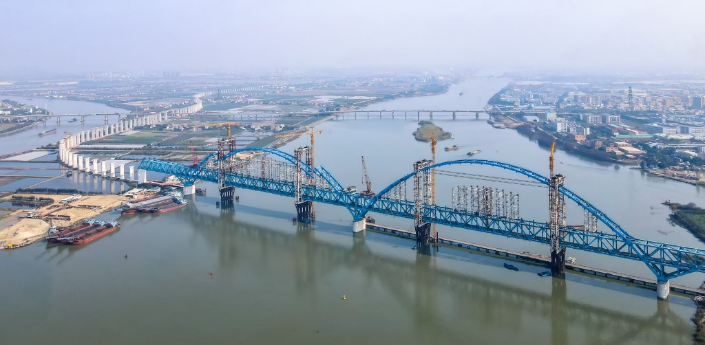 由中国铁路广州局集团公司江门工程建设指挥部负责建设管理、中铁六局广州公司承建的跨洪奇沥水道特大桥是南沙港铁路全线的关键性控制工程,主桥全长998米,主跨360米,采用双主跨钢桁梁柔性拱技术建造,为目前国内外同类型桥梁最大跨度,被誉为“亚洲第一跨”。 该桥犹如一道钢铁彩虹横跨洪奇沥水道,双拱呈两个半圆形状,蓝色钢梁时尚而轻盈,颇具艺术美感,可谓颜值爆表。