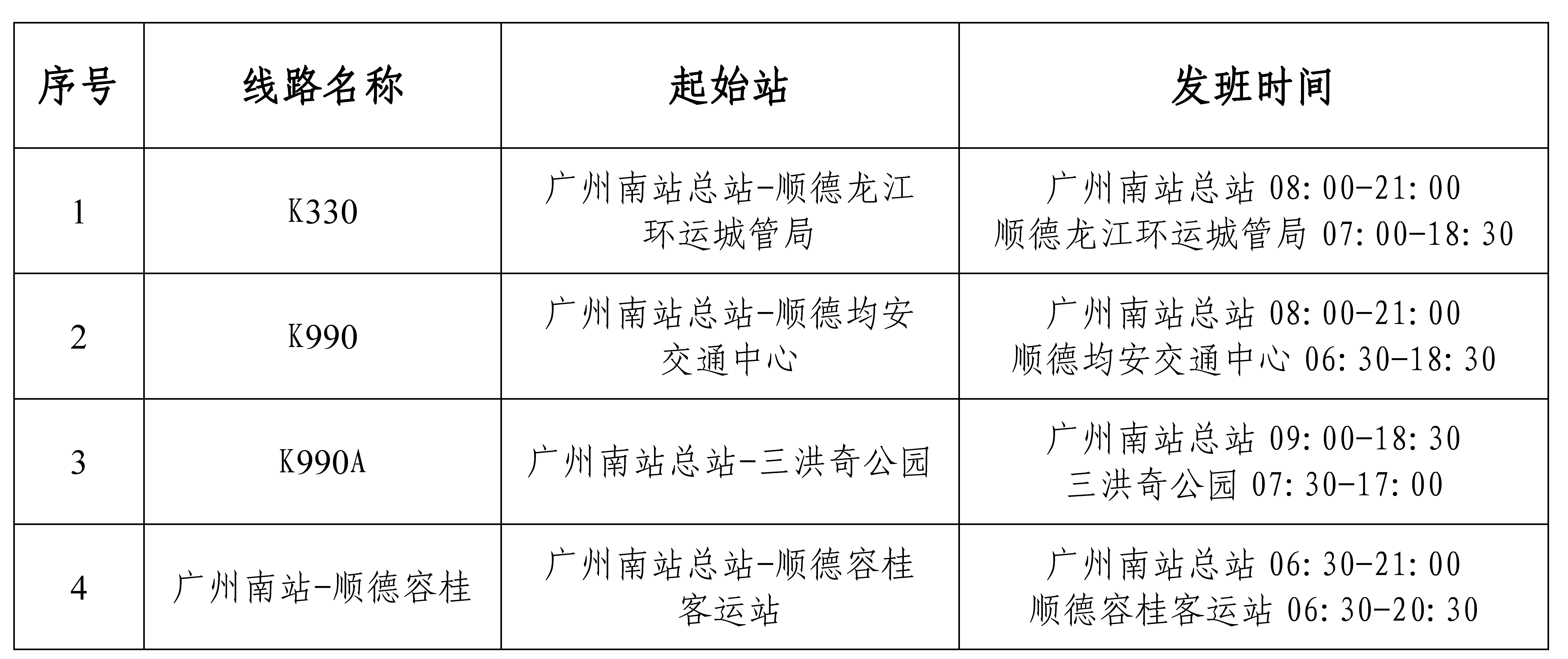 往佛山、顺德方向线路:K330(广州南站-顺德龙江环运城管局)、K990(广州南站-顺德均安交通中心)、K990A(广州南站-三洪奇公园)、广州南站-顺德容桂