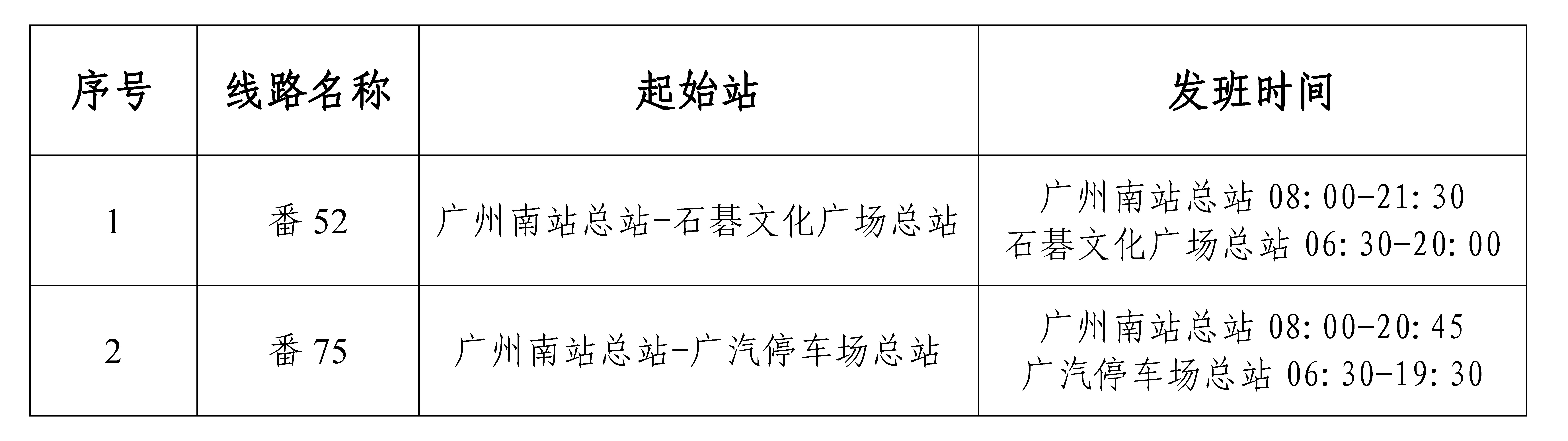 往番禺方向线路:番52(广州南站-石碁文化广场总站)、番75(广州南站总站-广汽停车场总站)