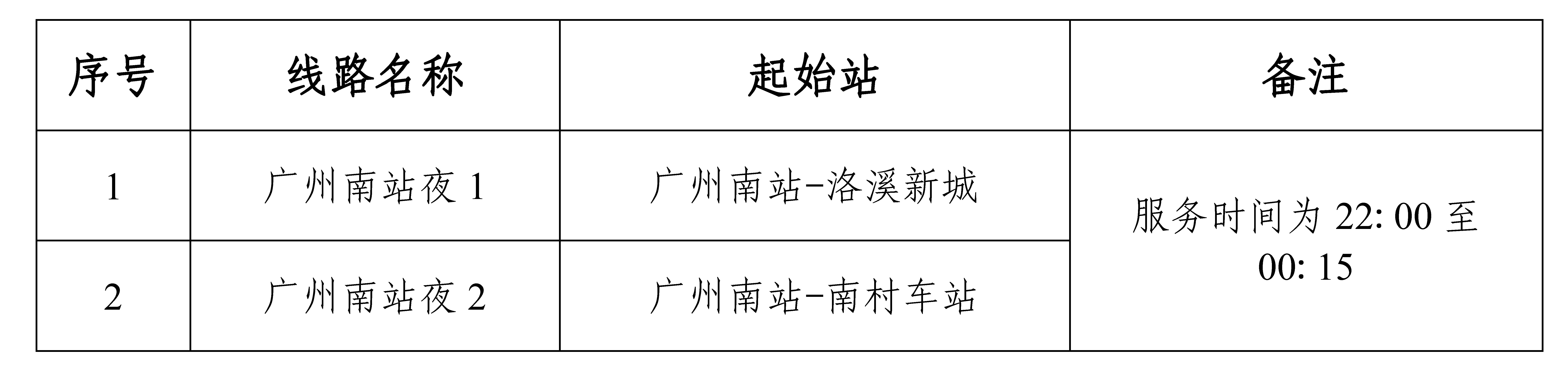 往番禺方向2条夜班公交线:广州南站夜1(广州南站-洛溪新城)、广州南站夜2(广州南站-南村车站)