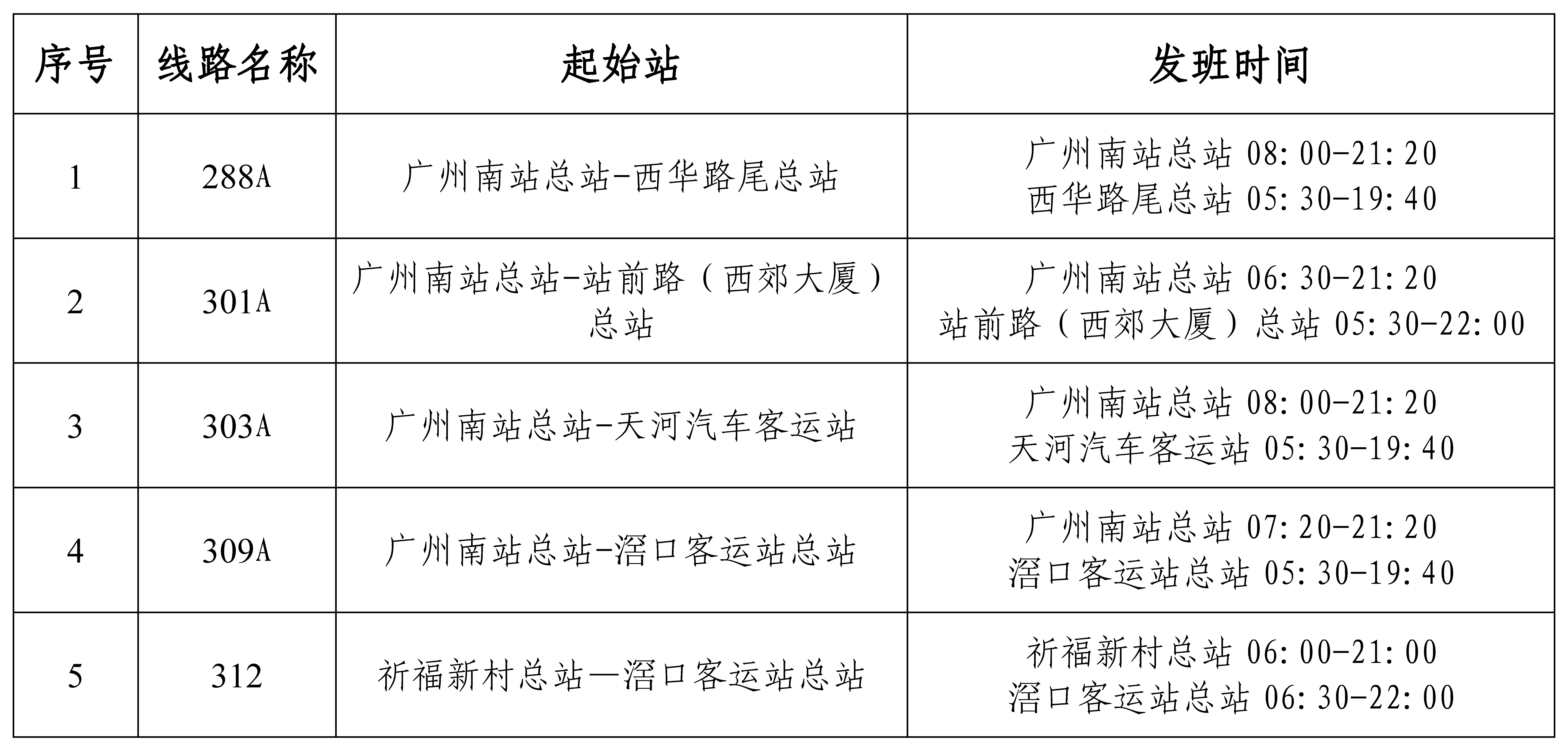 1月28日-3月8日将市区开往广州南站的288A、301A、303A、309A四条公交线路首班车提前至5:30发班,以便于旅客实现春运返乡旅客错峰出行。