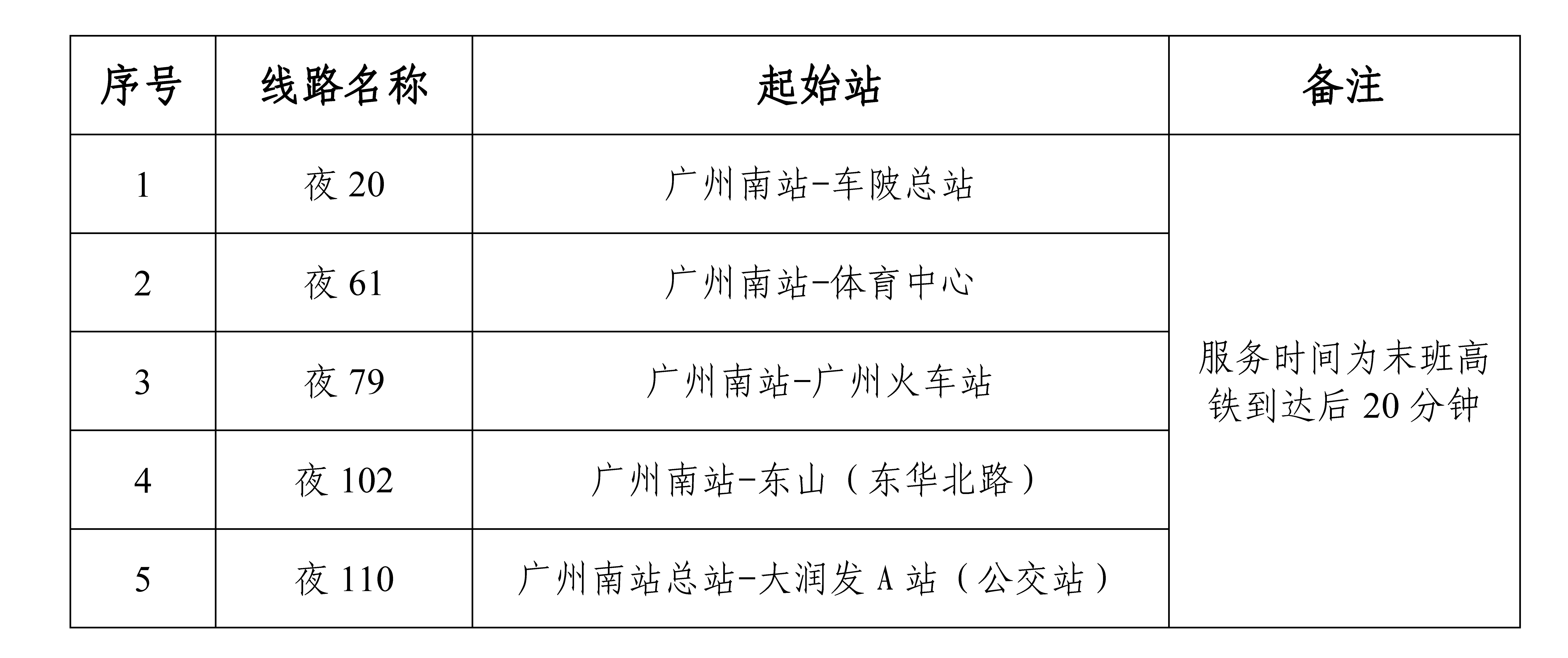 往广州、佛山方向5条夜班公交线:夜20(广州南站-车陂总站)、夜61(广州南站-体育中心)、夜79(广州南站-广州火车站)、夜102(广州南站-东山(东华北路))、夜110(广州南站总站-大润发A站(公交站))