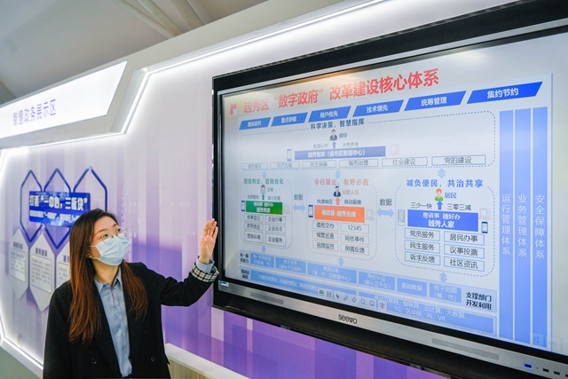 图为越秀区政数局向记者介绍“数字政府”改革建设核心体系。信息时报记者 胡瀛斌 摄
