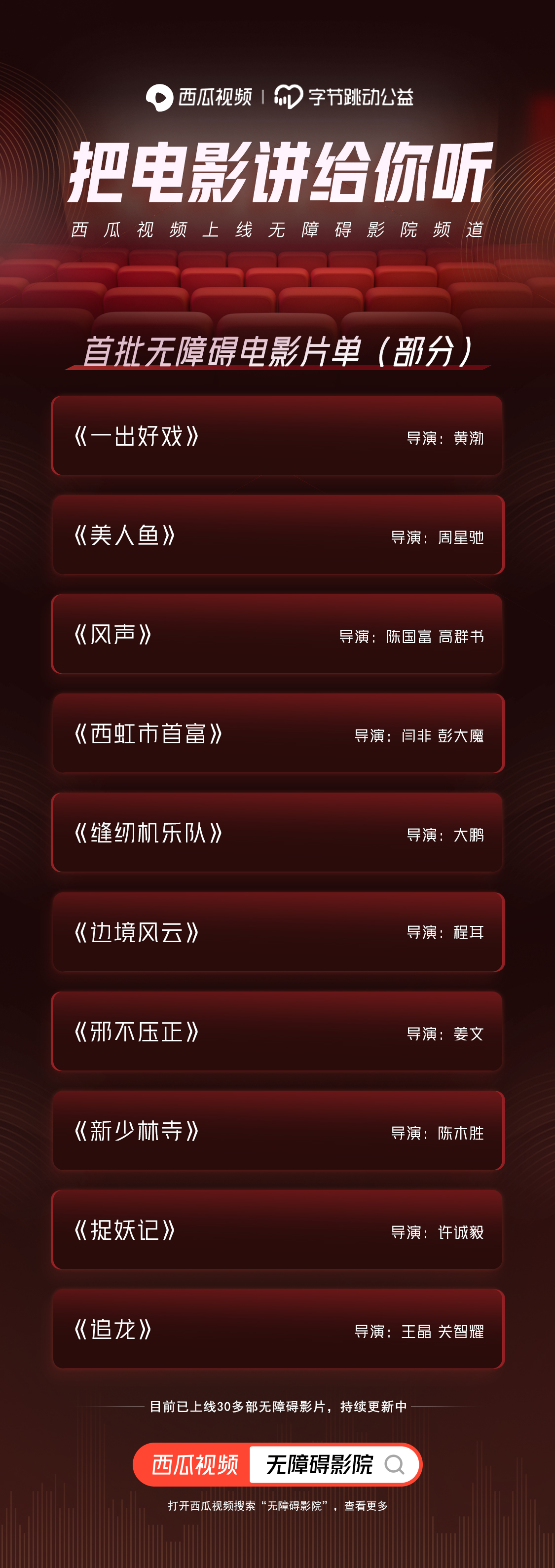近日,西瓜视频PC端和移动端同时上线无障碍影院频道,为视障人士提供包括《一出好戏》《邪不压正》在内的30余部无障碍电影,并将保持每月10部以上专供影片的更新服务。