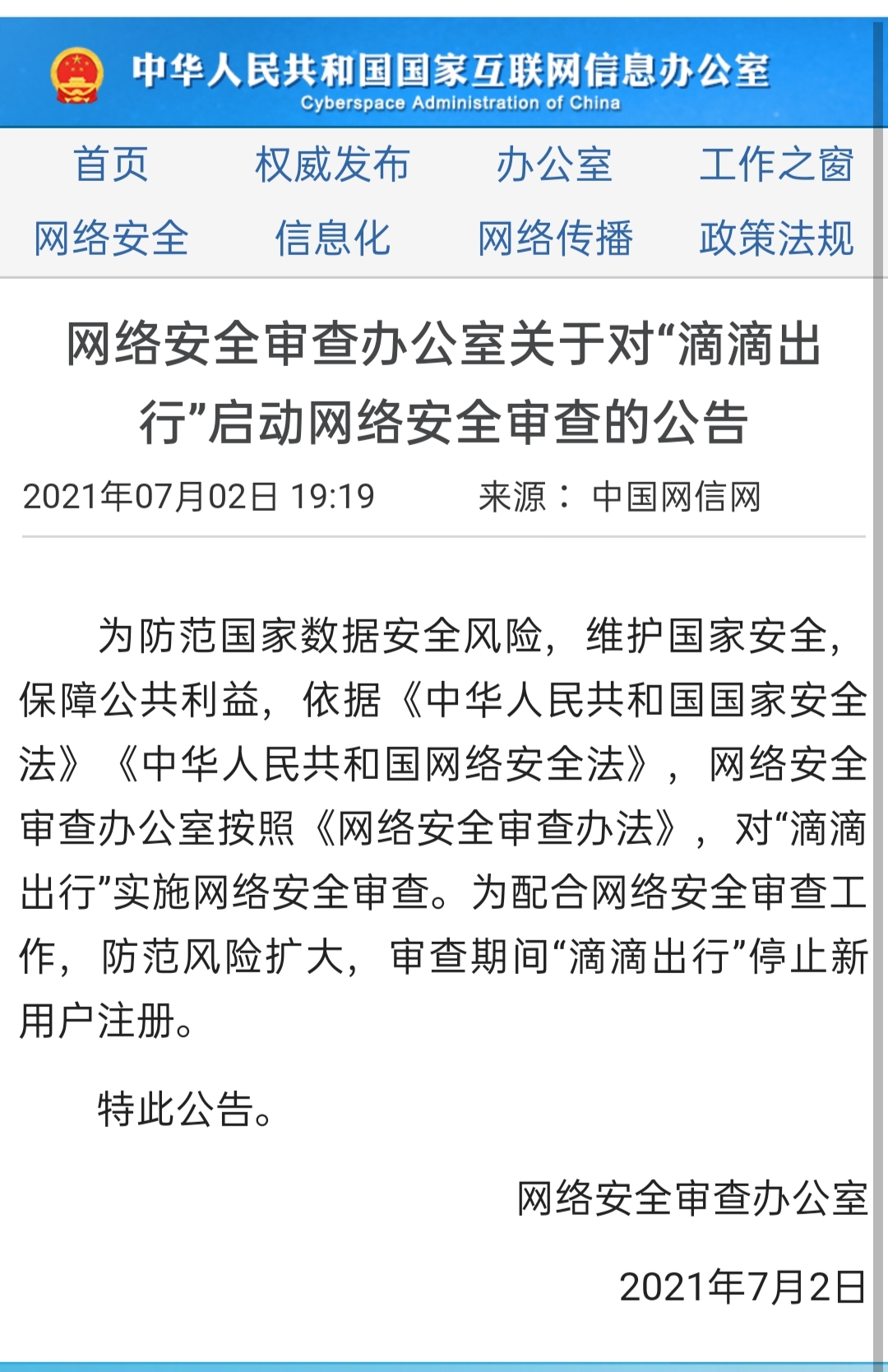 7月2日, 国家互联网信息办公室官网发布《网络安全审查办公室对于“滴滴出行”启动网络安全深处的公告》。