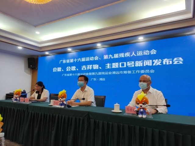 8月19日下午,省运会清远市筹委会指挥部在清远国际会展中心召开新闻发布会,正式对外公布广东省第十六届运动会、第九届残疾人运动会会徽、会歌、吉祥物、主题口号。