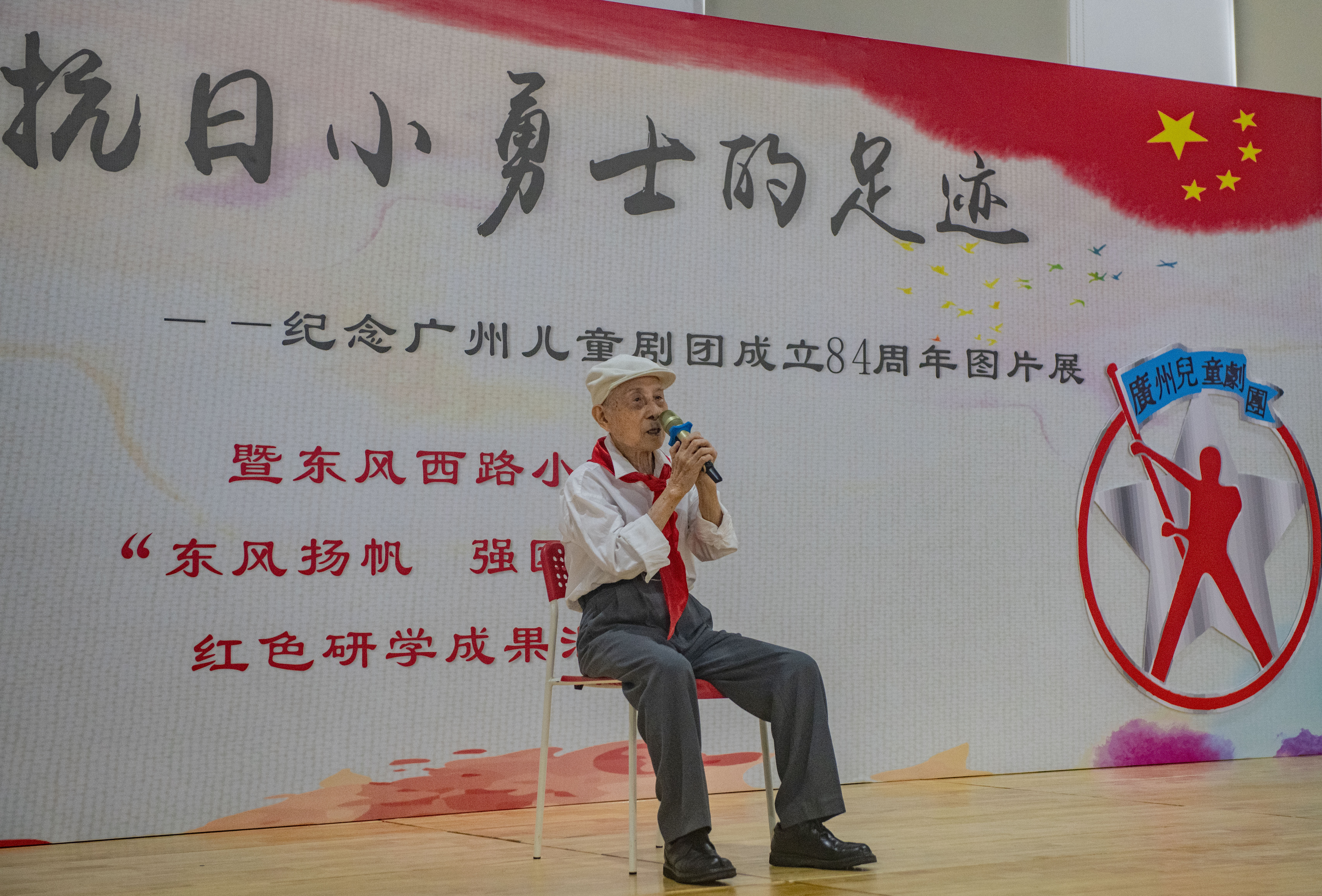 “1937年7月7日卢沟桥事变后,广州所有的学校被迫停课,一些小学生开始了抗日宣传。中共地下党员、青年教师谈星注意到这个情况,在组织的安排下,吸收各区优秀少年儿童,在当年9月18日组建了广州儿童剧团。130多名团员,最大的十四五岁,最小的只有八九岁,他们活跃在街头、伤兵医院、难民营,冒着敌人的炮火,坚持用歌声和戏剧,宣传抗日……”杨永洪娓娓道来。广州儿童剧团成立刚满一年,1938年10月,日军进逼广州,19名剧团成员背井离乡,翻山涉水,转战广西。“我们刚在黄沙码头登上小艇,一回头,珠江岸边的大新公司已升起了滚滚浓烟。渡过白鹅潭的时候,大家悲愤激昂,使劲唱着‘中国不会亡,不会亡,不会亡。’”杨老说,这画面他至今历历在目。到达石围塘火车站后,团员们沿广三铁路向西走,一路风餐露宿,一路开展抗日宣传,历时10多天才到广西梧州。此后四年,广州儿童剧团在梧州、柳州、桂林、南宁等地活动,他们还开办抗战建国实验小学,唤起抗日斗志,深受当地群众欢迎。