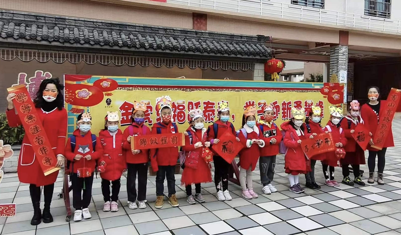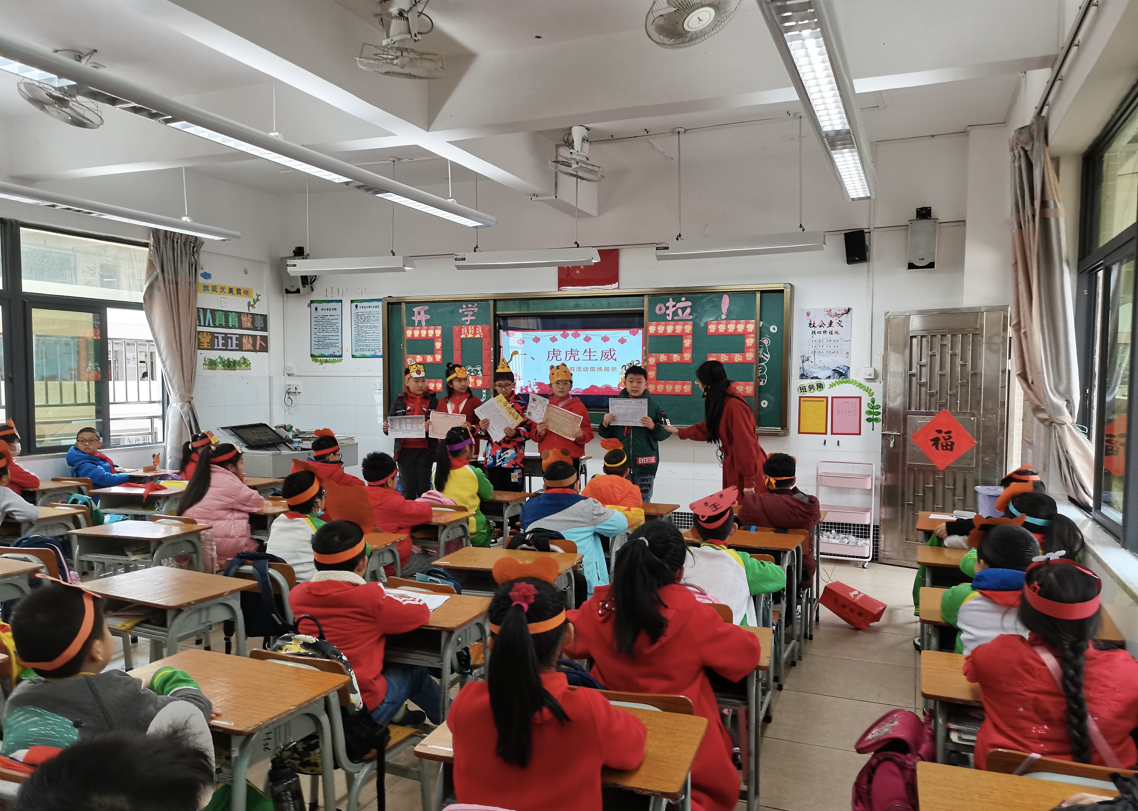 番禺区南村镇南华小学贴上学生写的福字,祝福新学期。