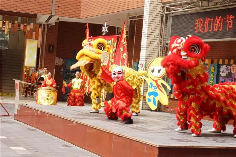 随着锣鼓敲响,醒狮爬上高竿,表演"采青”“高台饮水”“狮子吐球”,为大家带来精彩纷呈的高空表演。"小狮子"跟随"大头佛"手上葵花扇的指引,上窜下跳,可爱至极,鼓点有节奏地应和着。表演吸引了全体师生的目光,现场气氛热闹。