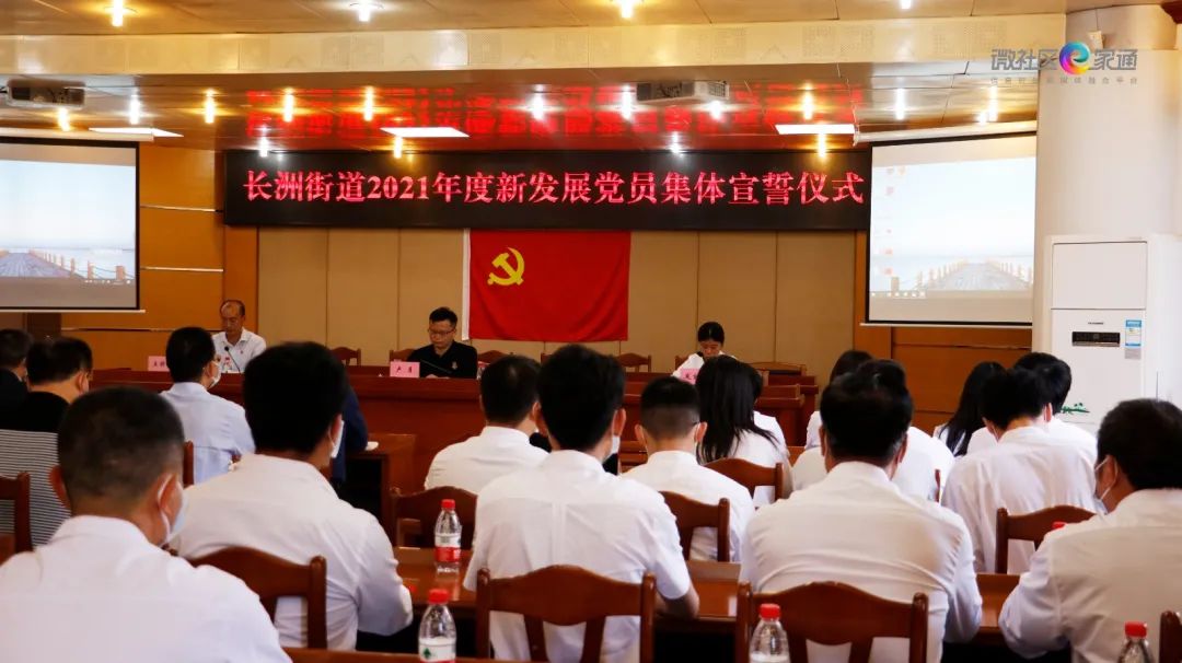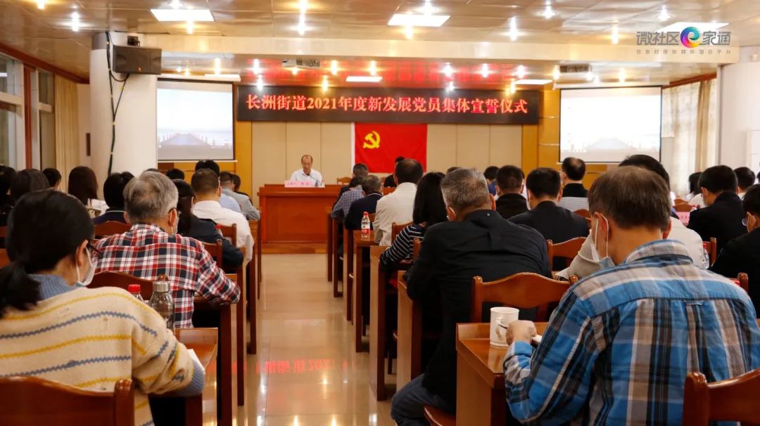 2021年度新发展党员集体宣誓仪式在气势磅礴的《国际歌》中拉开序幕。长洲街道党工委副书记、办事处主任卢勇代表长洲街道党工委对新发展的预备党员表示了祝贺,对18名新党员提出要求并寄予期望,希望大家在日后的学习、工作中能按照入党誓词严格要求自己,充分发挥先锋模范带头作用,努力用科学理论武装自己,为实现中华民族伟大复兴的中国梦贡献自己的力量。长洲街道办事处副主任周斌宣读了长洲街道党工委同意接受预备党员的批复和预备党员名单。