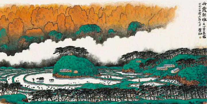 岭南画坛的诸多名家同样对青绿及重彩山水在现当代的发展贡献了重要的力量,关山月、黎雄才、梁世雄、陈章绩、林丰俗、陈新华、李劲堃、张彦、张东等人皆有重要的青绿、重彩山水画作品,比如关山月《长城内外尽朝晖》、黎雄才《一览众山小》、梁世雄《红日照西沙》、林丰俗《丹霞朝暾》、李劲堃《炼日》、陈新华《山家》等。