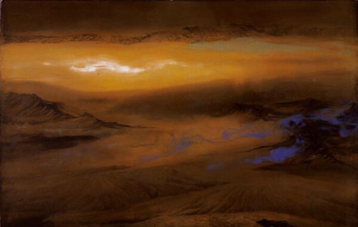 李劲堃的重彩得益于其当年对油画的学习,在他的作品中,伦勃朗的“光”、德拉克洛瓦的“细腻”及色彩对视觉的影响、中国传统的笔墨与意境业已被熔炼在一起,从而营造出一种既有天旷迷离的恍惚感,又有着细致把玩的触摸感。这种展现更是在某种程度践行着岭南画派“折衷中西、融汇古今”的艺术宗旨。
