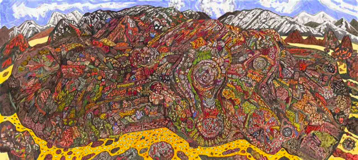 陈新华则对民间色彩情有独钟,大胆地突破了传统山水画对色彩的桎梏,各种鲜艳的色彩都在他的作品中得到释放。加上他在作品的形象上并不拘泥于狭隘的具象范畴,将事物的微观与宏观都以其独特的理解与转化进行重组,因此在岭南地区的重彩山水画家中独树一帜。
