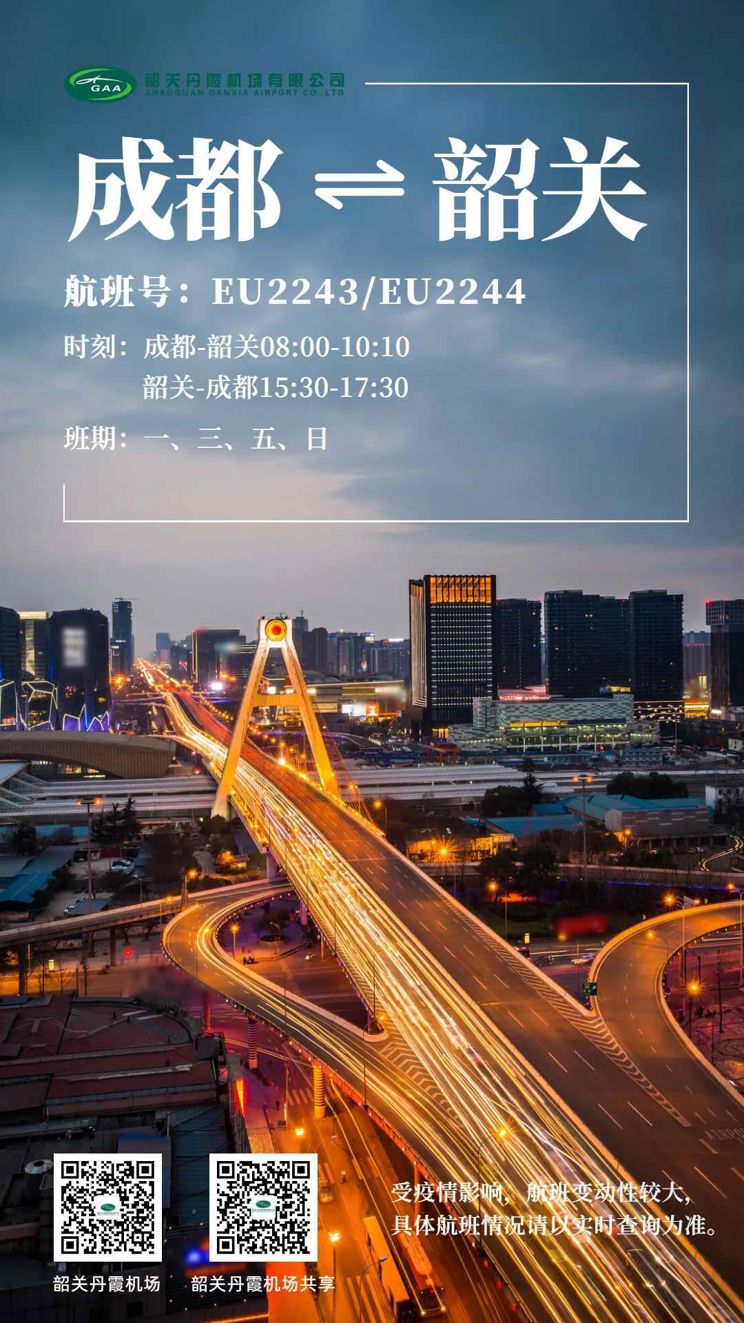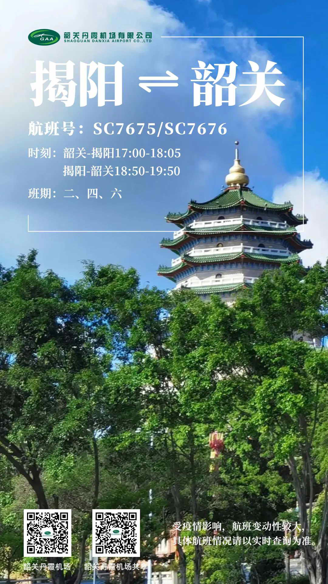 此前,韶关丹霞机场已开通北京大兴⇌韶关、上海浦东⇌韶关⇌南宁、杭州⇌韶关⇌昆明、青岛⇌韶关⇌揭阳等多条热门航线。