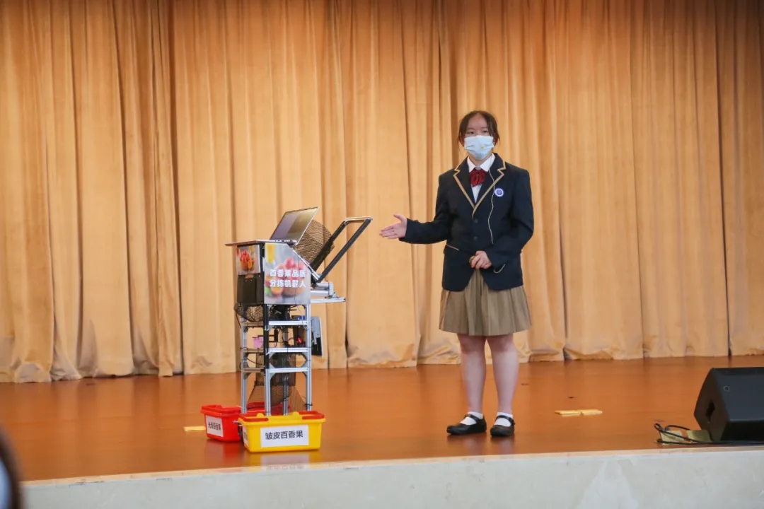 学校秉承“以学生健康发展、全面发展、终身发展为本”的教育理念,在全市率先成立“学生发展指导委员会”,聘请清华大学、华东师范大学等高校教授及家长代表担任学生发展指导导师,构筑全方位学生发展指导体系,助力学生身心健康成长。 学校通过课程开发、基地建设、研学实践、学科竞赛、社团活动等多种形式让同学们感受科技的力量。其中初中校区初二(3)班刘幸怡同学就是在这片土壤中滋养出来的佼佼者,她为大家展示并介绍了她的项目作品——《分拣易—基于 MobileNet V3网络的深度学习百香果分拣机器人》,该作品获得了第二十一届广东省青少年机器人竞赛创意机器人项目一等奖第一名,第37届广州市青少年科技创新大赛一等奖第一名。