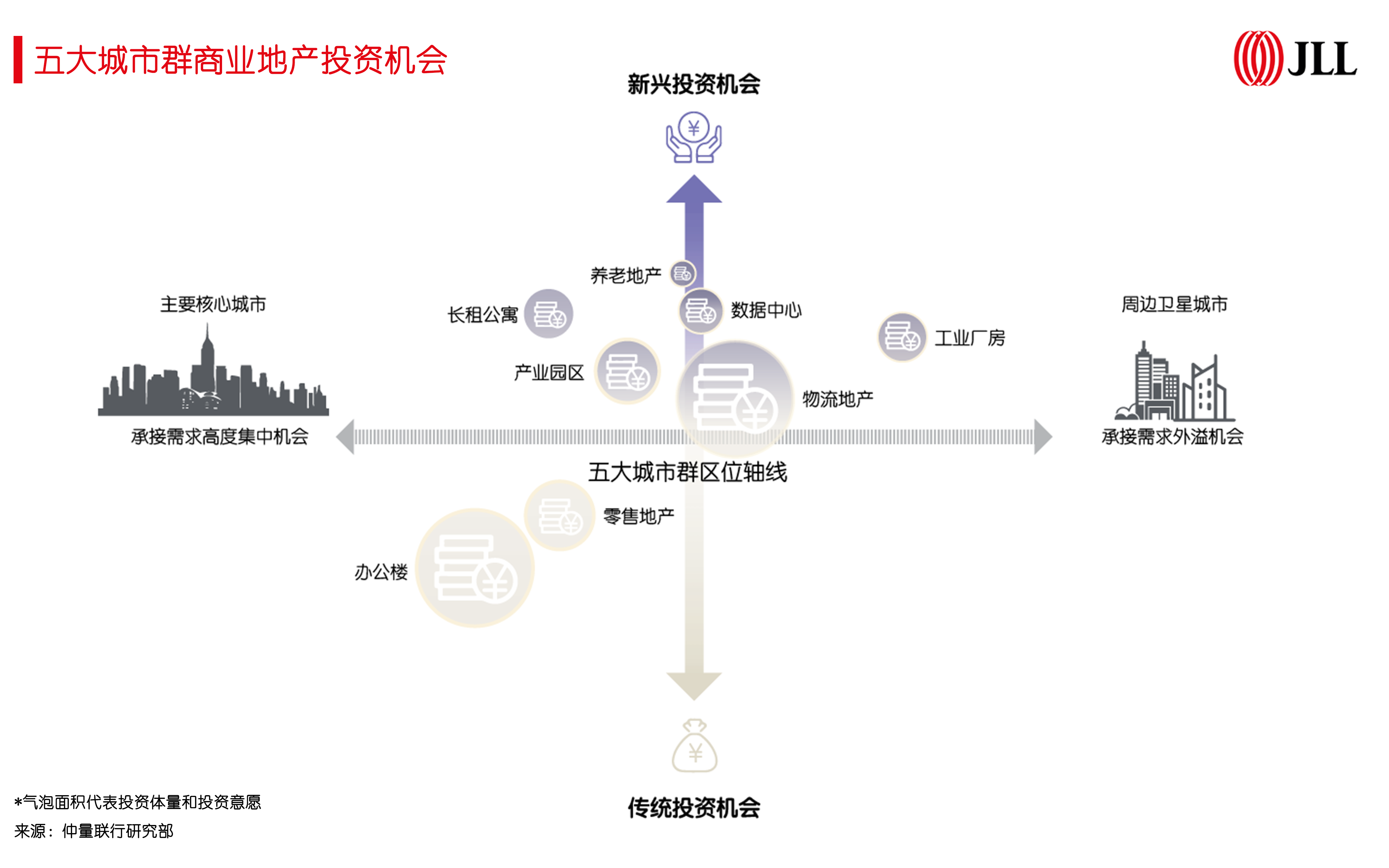 在城市群协同发展的新格局下,商业地产市场正蕴含着多元化、多层次的投资机遇。仲量联行研究部总监姚耀表示,五大城市群中的主要核心城市将在支撑传统的办公楼和零售地产市场的同时,催生产业园区、长租公寓和养老地产等新兴投资机会。周边卫星城则将承接需求外溢,物流地产将迎重大利好,工业厂房、数据中心和养老地产等也将获得投资者的关注。随着各物业类型的需求进一步演进,将推动商业地产投资机会愈发多元化。