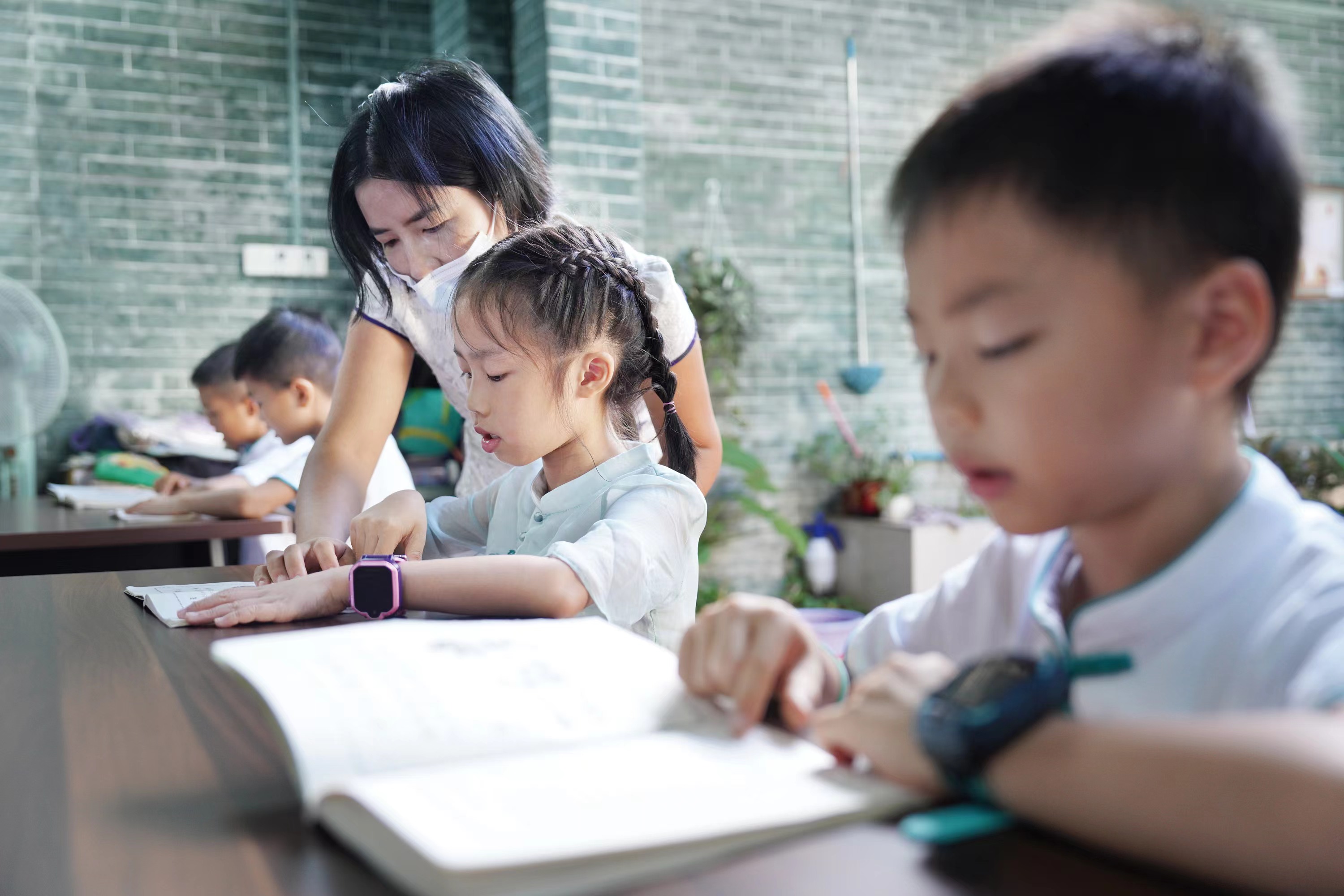 友竹家塾的国学文化公益课老师梁慧均告诉记者,国学课今年暑期首次开班,每周一至五开课,来上课的孩子从5岁到11岁不等,大多是住在本村的村民。国学课十分受欢迎,因为课堂只提供18个位置,所以还吸引了不少旁听生。“孩子们早早便会来到家塾读书,我们从上午9点开始教授《弟子规》,10点安排学生练字。” 梁慧均表示,希望通过国学课让孩子们从小学会待人礼仪,学会感恩和尊师重道。