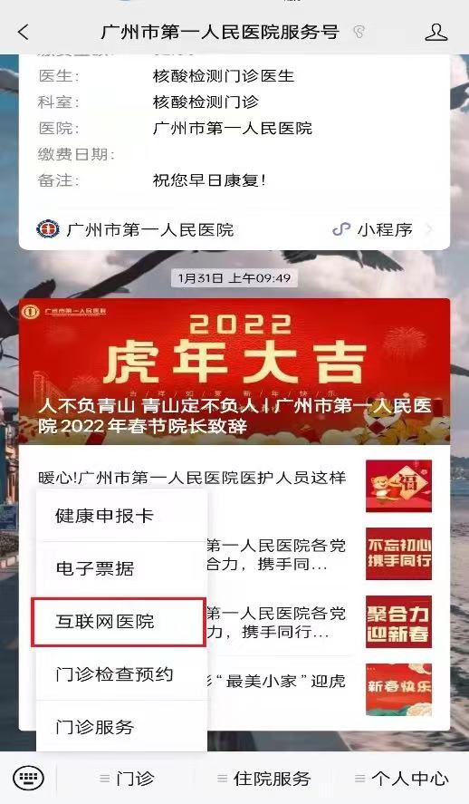 ①关注【广州市第一人民医院】微信服务号,点击门诊,进入【互联网医院】小程序,选择【线上门诊】或【医保门诊】;