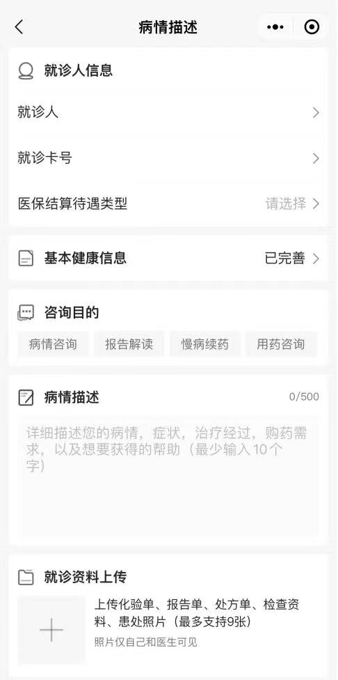 ②选择咨询目的,填写病情描述,上传患者就诊相关资料。