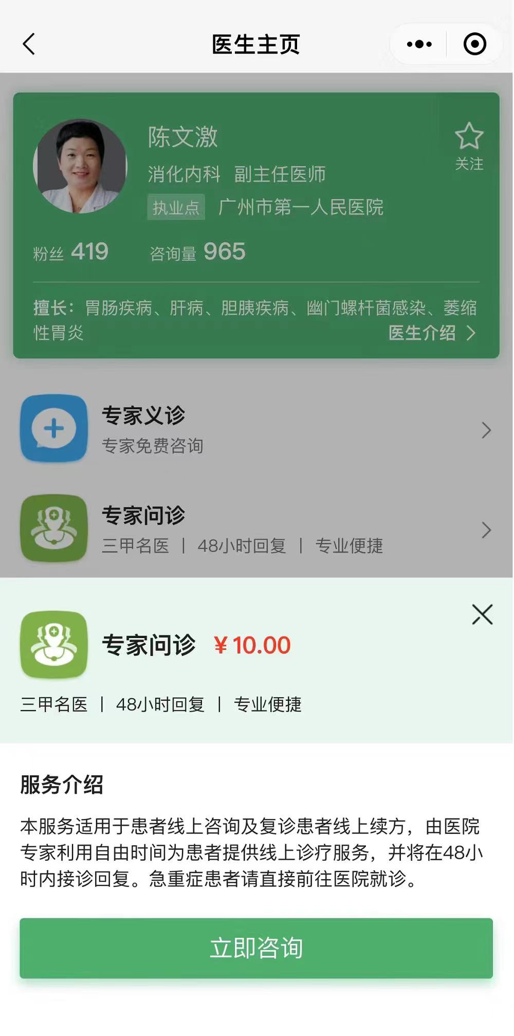 ② 选择科室及医生,进入医生主页,点击【专家问诊】-【立即咨询】。