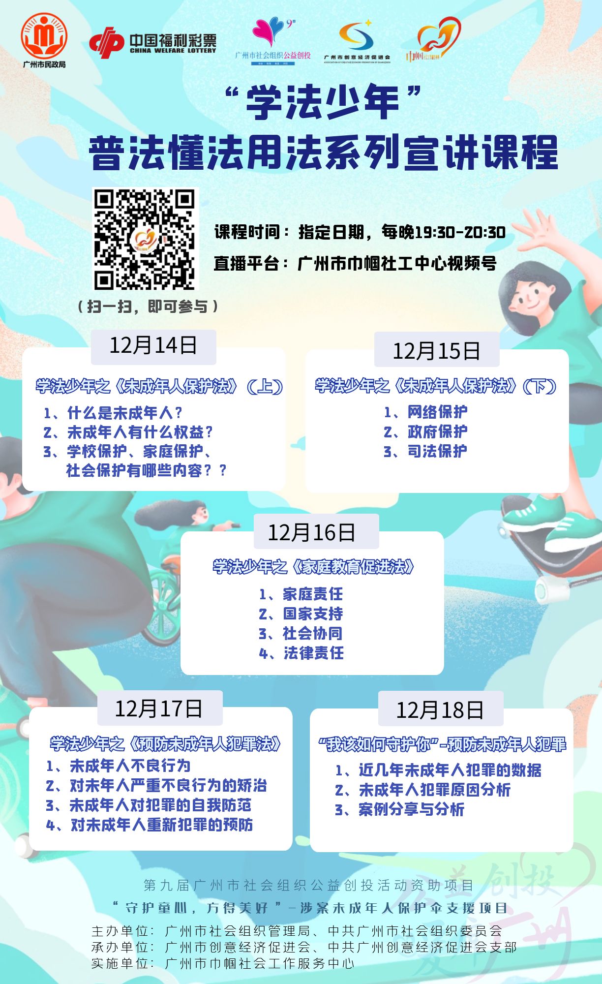 记者今日了解到,为推进《未成年人保护法》《预防未成年人犯罪法》《家庭教育促进法》三部法律内容宣传普及,广州市巾帼社会工作服务中心守护童心,方得美好-涉案未成年人保护伞支援项目整合各方优势资源,链接专业律师资源,12月14-18日每晚19:30-20:30,项目将以线上宣讲课程的方式开展“学法少年”普法懂法用法系列线上宣讲活动,让参与者认识到保护未成人的重要性,号召全社会共同关注、关爱未成年人的权益维护,预防未成年人走上违法犯罪的道路,推动社会各界对未成年人法治教育的关注。