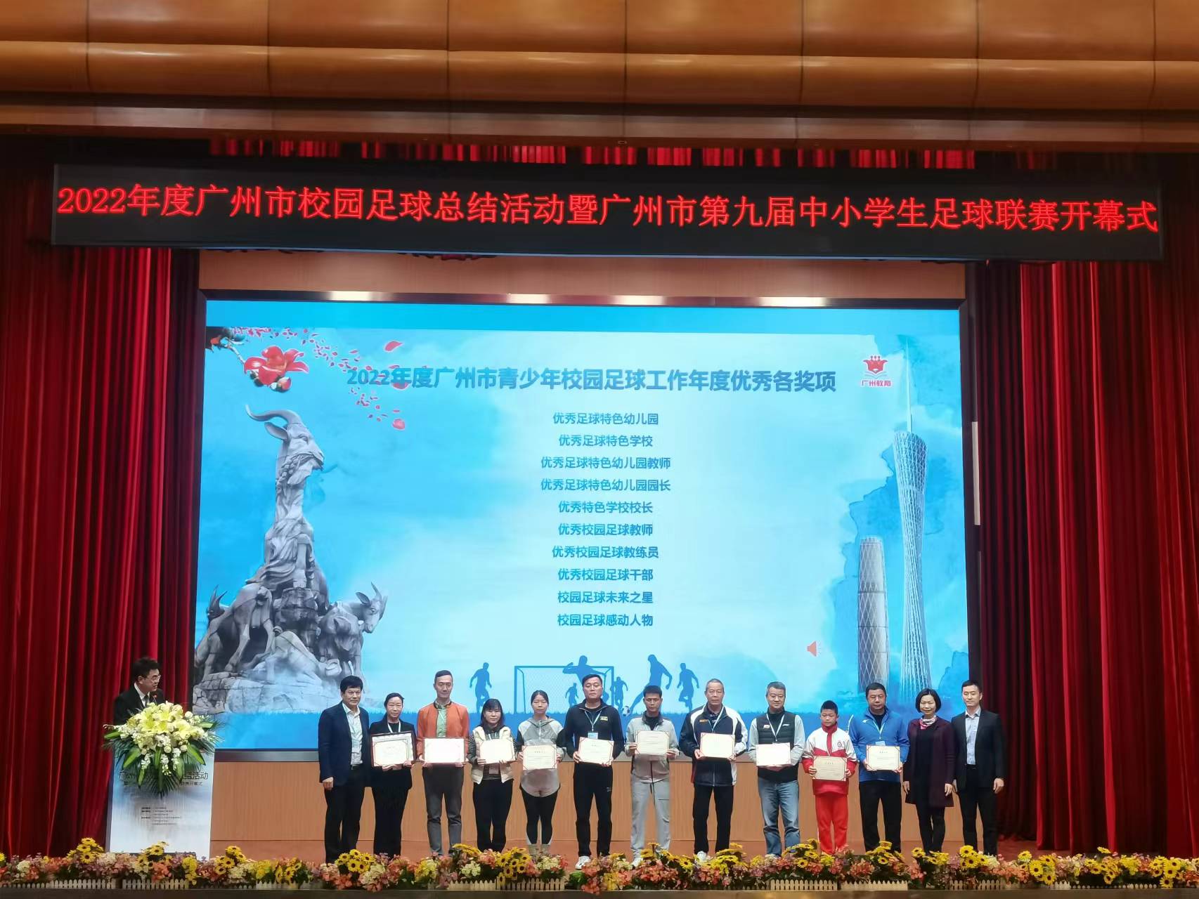 活动现场为2022年对广州校园足球发展做出突出贡献的60个集体和262名个人颁发证书。包括优秀足球特色幼儿园、优秀校园足球特色学校2个集体奖项,以及优秀足球特色幼儿园教师、优秀足球特色幼儿园园长、优秀校园足球教师、优秀校园足球教练员、优秀特色学校校长、优秀校园足球干部、校园足球未来之星、校园足球感动人物8项个人奖项。详情可查询市教育局官网。(点这里)
