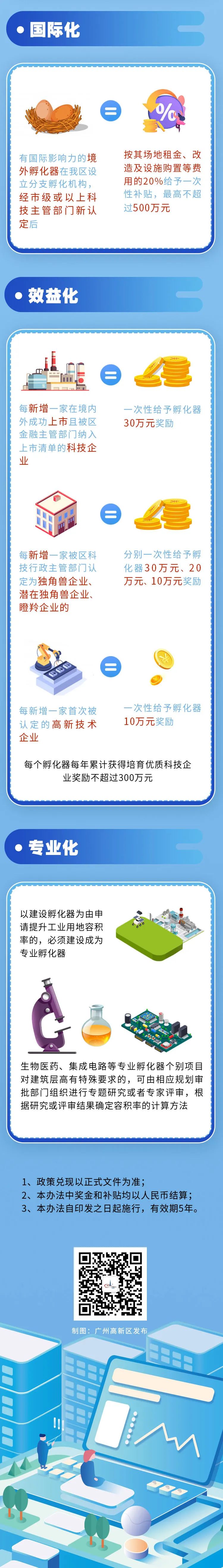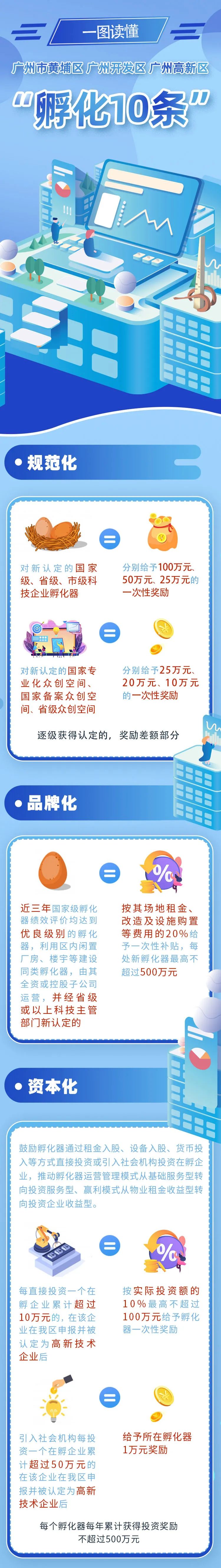 ■ 出台《广州市黄埔区 广州开发区 广州高新区促进创新创业孵化器高质量发展办法》(即“孵化10条”),重点引导孵化器向规范化、品牌化、资本化、国际化、效益化、专业化、生态化等方向择优发展。