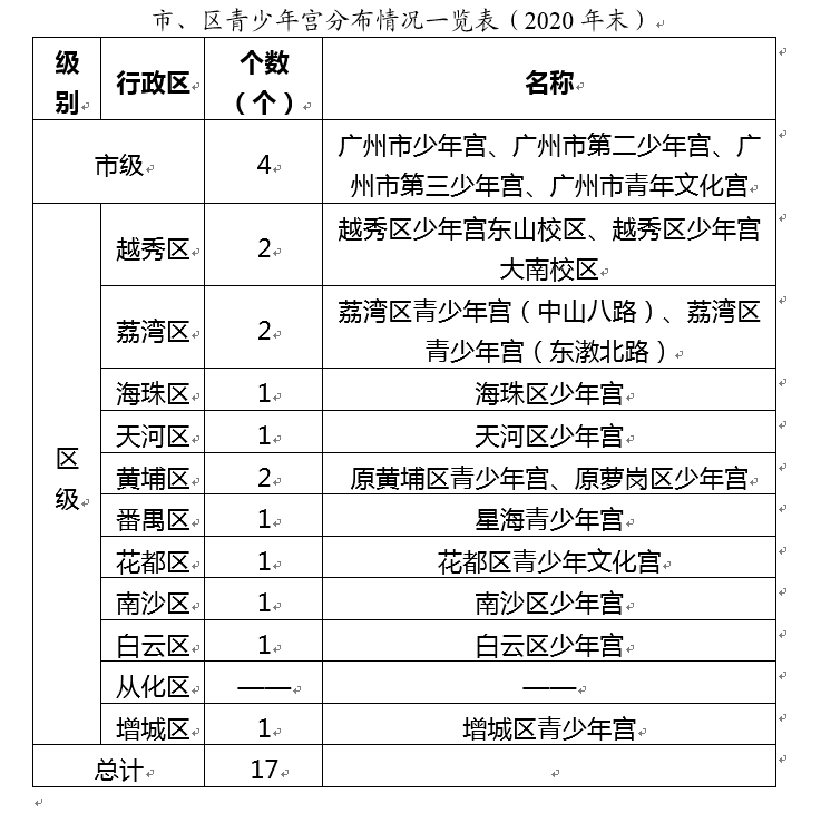 根据《规划》,截至2020年底,广州有市级青少年宫4个,包括广州市少年宫、广州市第二少年宫、广州市第三少年宫、广州市青年文化宫。区级13个,总建筑面积37.61万平方米,每年约提供学位总量28.77万个。