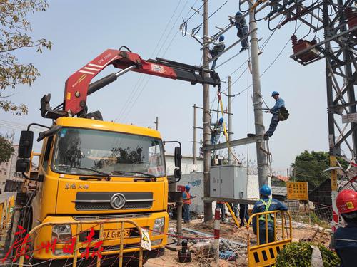 3月3日,在南沙区长莫村17号台区,为满足负荷增长需求而新增的配电台架,广州供电局施工人员正在开展配套金具安装及吊装作业。