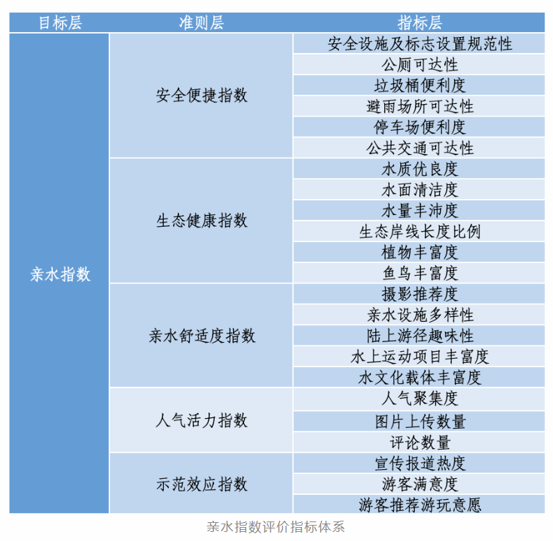 《报告》提出的“亲水指数”将化学领域的亲水指数概念进行拓展和创新,紧密围绕幸福河湖内涵,以碧道、湿地公园、水利风景区等滨水公共空间为主要评价对象,从亲水舒适指数、生态健康指数、安全便捷指数、人气活力指数、示范效应指数五个准则层,构建了共23个指标的评价体系,并结合实际制定了赋分标准表。“亲水指数”对评价对象的生态环境条件、公众参与各类亲水活动的切身体验等进行定量、客观评价,努力提供“好玩、好用、有好处”的用户体验。与水质指数等其他专业指数相比,亲水指数更加突出“亲民”属性,将各类专业的数据评价映射转化成通俗易懂的综合评价等级,其评价结果可以为公众休闲出行特别是亲水乐水提供科学向导,有效促进涉水文化旅游经济产业的发展,营造公众亲水乐水向水而生的幸福氛围。