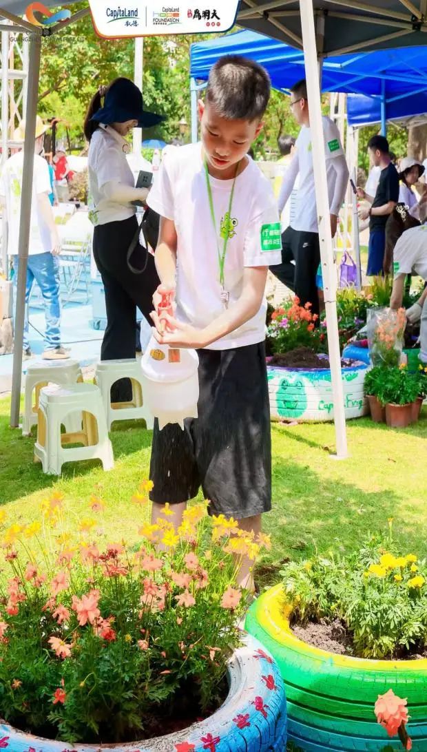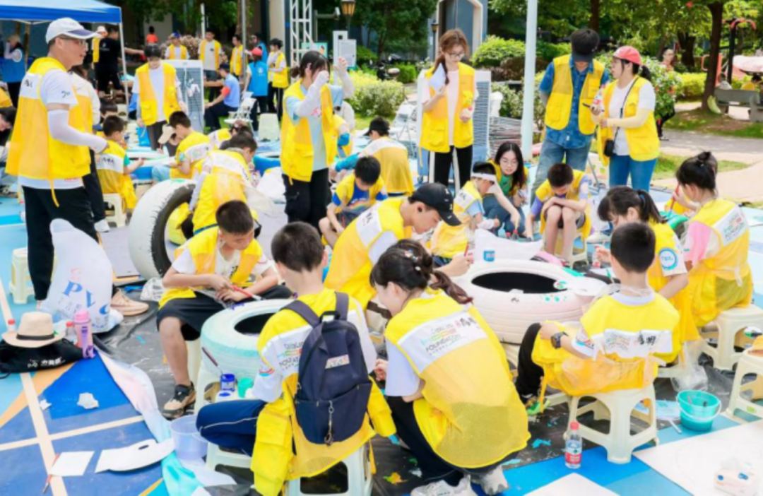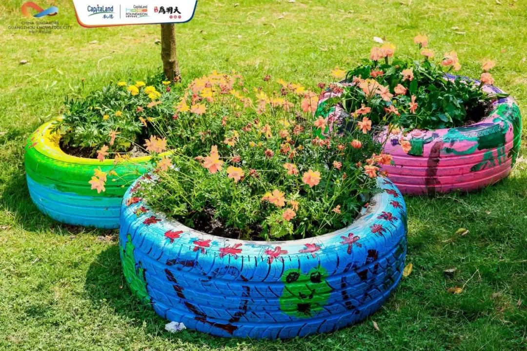 活动中,孩子们通过在废旧轮胎上彩绘,并在轮胎内种上植物的方式,将生活中的废弃物品用以装饰美化绿地,体现了环保新风尚。