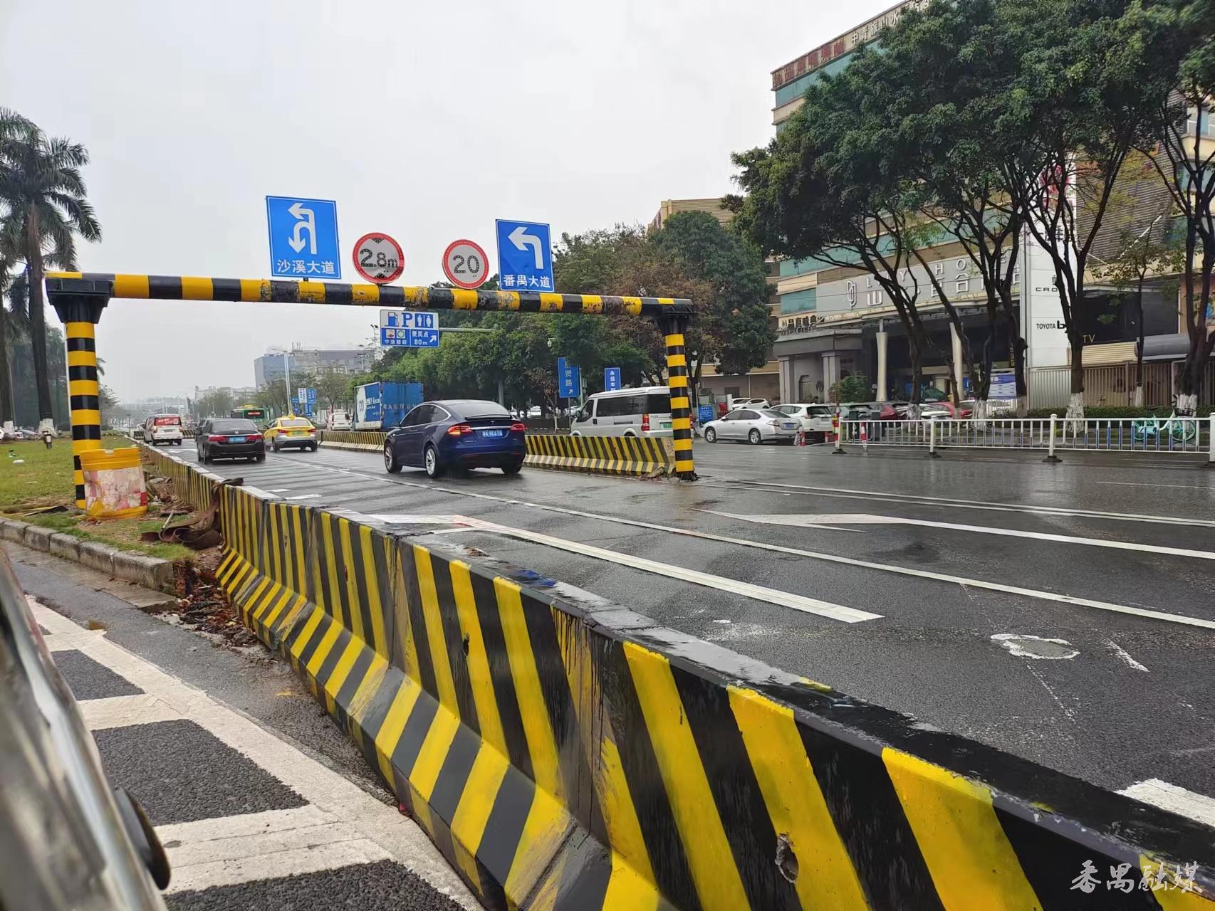 因该掉头位地下管线复杂等问题无法拆除中间绿化岛,番禺区交通运输局采取在原掉头与左转共用1条车道的基础上将掉头位北移,使其提前与左转车道分开,并新增了1条左转专用车道。同时,结合车辆转弯半径将原2.5米高限高架改造为2.8米高限高架,满足更多车辆通行要求。通过一系列的交通微改造,一定程度上缓解了迎宾路沙溪大桥南北往北掉头位节点的交通拥堵,增强了该掉头位的通行能力。
