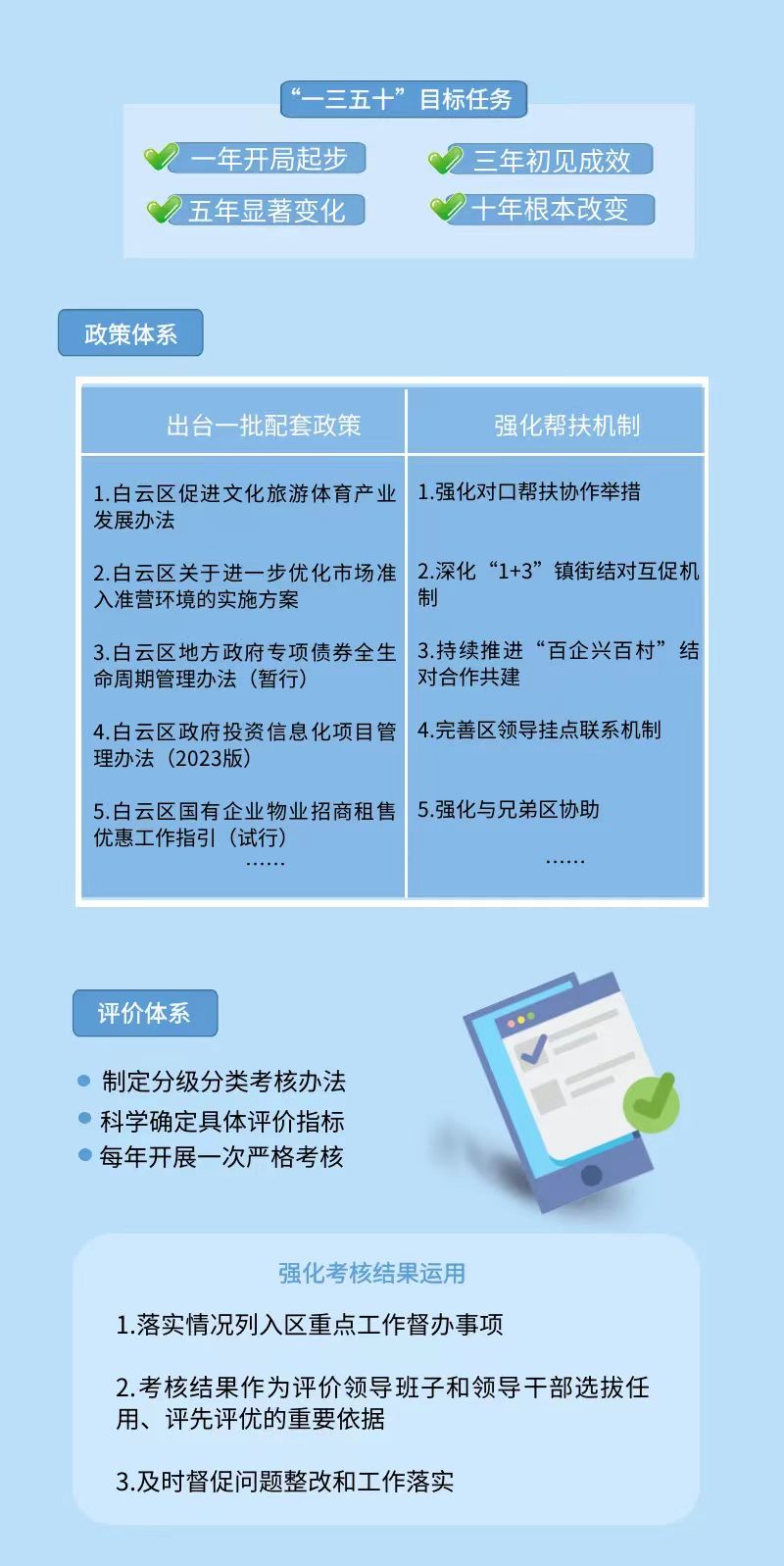 根据《实施方案》,白云区将按照省、市关于实施“百县千镇万村高质量发展工程”的决策部署,锚定“一年开局起步、三年初见成效、五年显著变化、十年根本改变”的目标要求,加快白云区城乡区域一体化发展步伐,高水平推进城乡区域协调发展,厚植高质量发展新动能新优势,为广州实现老城市新活力、“四个出新出彩”作出白云贡献。