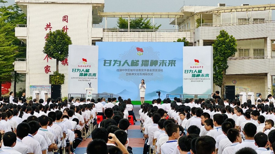爱是相互的。区敏玲老师心心念念的学校、同事、学生,不仅帮助她实现了遗愿,更将她的精神刻录在了红旗中学的校史里,让人缅怀、学习、传承。当天,区敏玲精神文化石在校内的香樟树下揭幕。象征石上刻有八个大字,“情牵香樟,爱洒桃李”——这是校园里一道最有爱的风景。