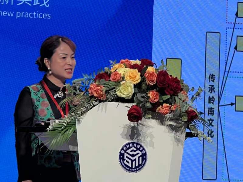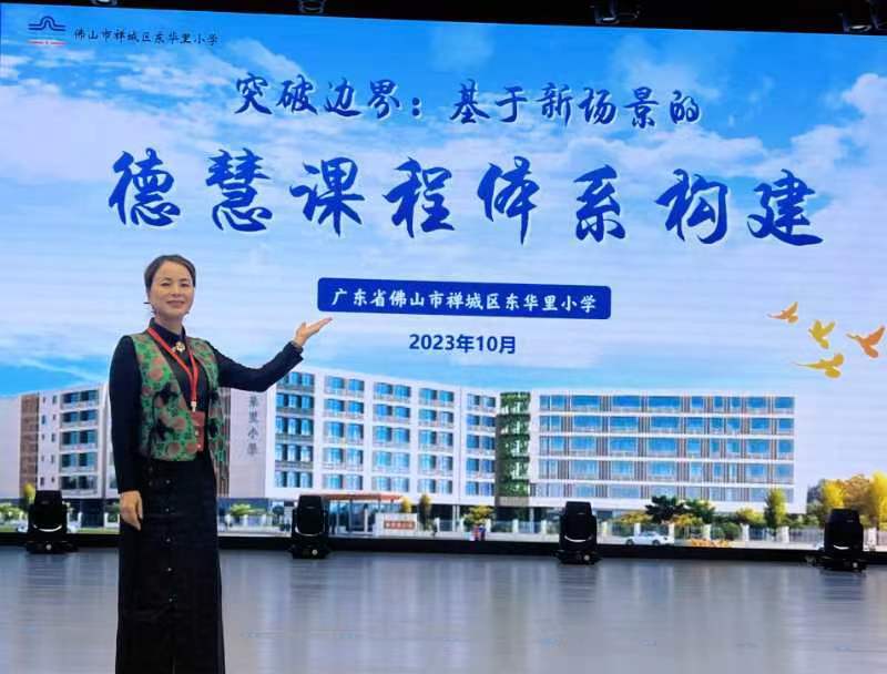 佛山市禅城区东华里小学校长熊丽丽应邀出席本次会议。她以“突破边界:基于新场景的德慧课程体系构建”为主题作主旨演讲,从“突出一个核心”“维持两个平衡”“体现三大注重”“实现四大回归”“取得五大成效”五个方面阐述了东华里小学的德慧课程体系构建。