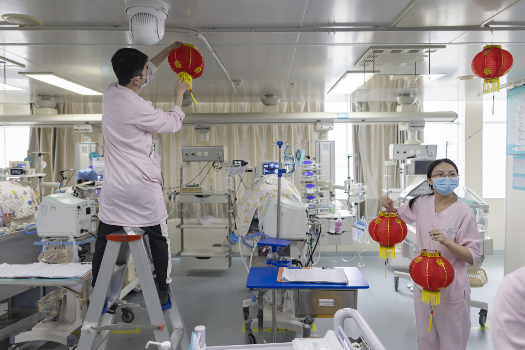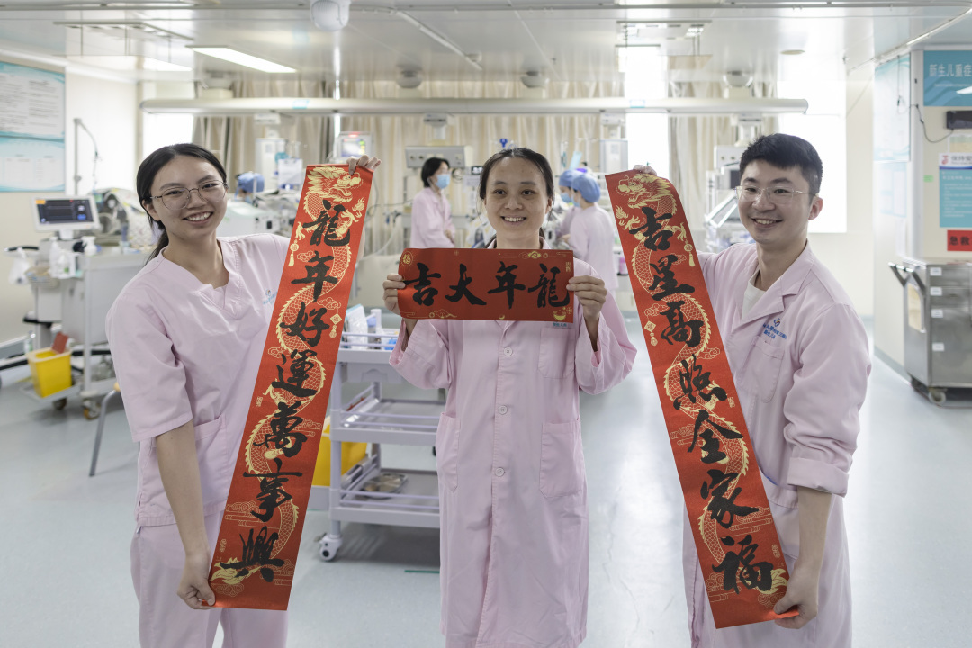 记者看到,在新生儿重症监护室,医护们挂起了灯笼、贴起了春联,让不能出院的孩子们也能感受到春节氛围。儿科护士长秦秀群还告诉记者,往常家属是无法进入新生儿科病房的,而在今年春节,为了满足家属与病房里的早产宝宝共度新年的愿望,科室推出了一项人性化的举措:在保证安全的情况下,举办新年仪式,让家属来到病房与孩子相聚,过一个暖心的团圆春节。