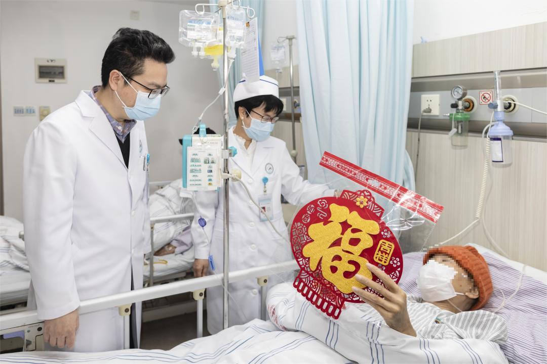 “来!送您个福袋,祝您早日出院!”在中山三院呼吸与危重症医学科的病区里,呼吸与危重症医学科主任周宇麒将装着贺年糖果和橘子的“福袋”送到患者欧阳阿姨(化名)手里。62岁的欧阳阿姨因为肺部感染,在1月12日入院接受治疗,虽然今年不能回家过年,但温馨的病房和医护的关照让她非常舒心。“现在感觉自己的身体在慢慢好转,在这里受到了很好的照顾,相信年后很快就能出院!”欧阳阿姨开心地说。